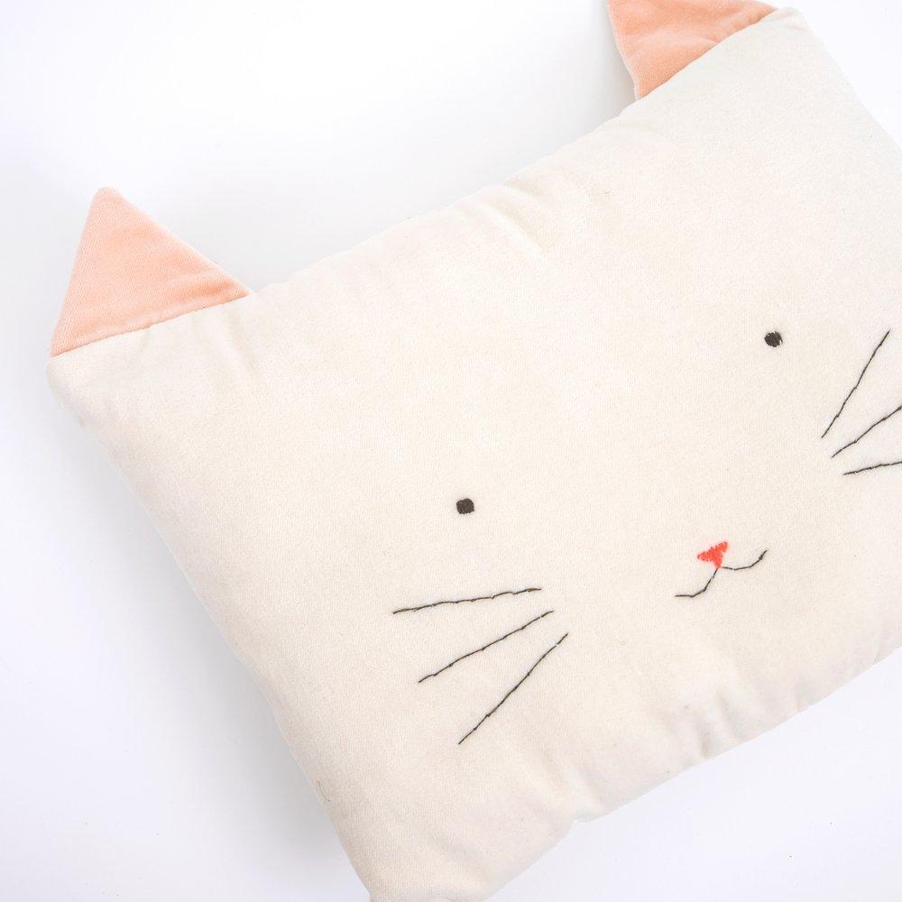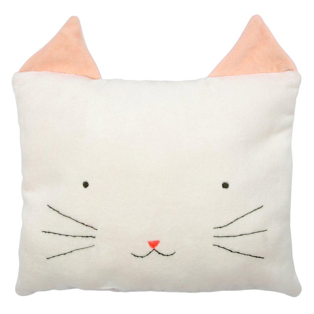 This soft cotton velvet cat cushion has sweet pointed ears and stitched features. Purrfect to cuddle up with and add fun to a room.