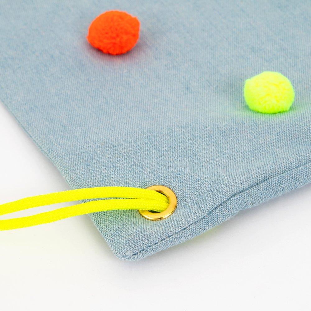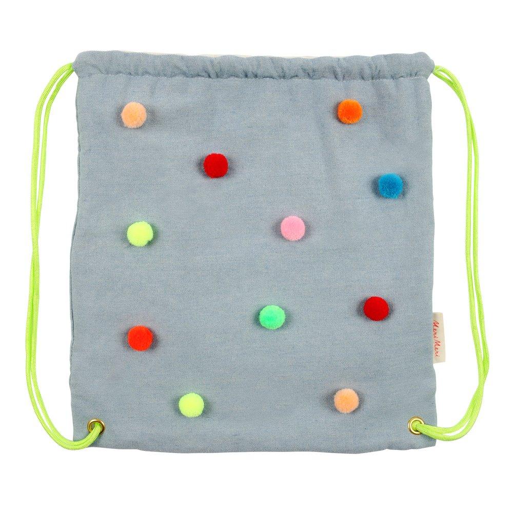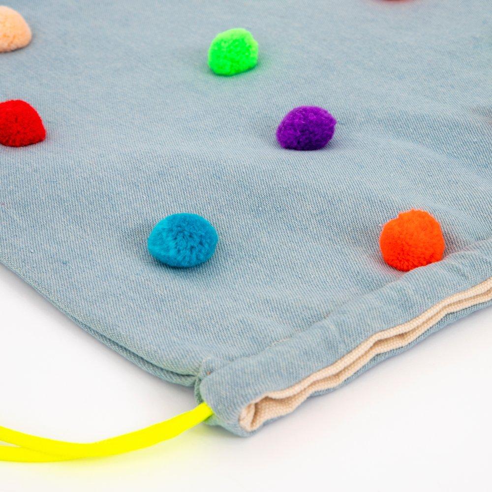 This cute backpack is crafted in chambray denim and decorated with lots of brightly coloured pompoms. Bright neon cord arm straps are attached with brass eyelets. It has a handy drawstring fastener and a cotton canvas inner lining.