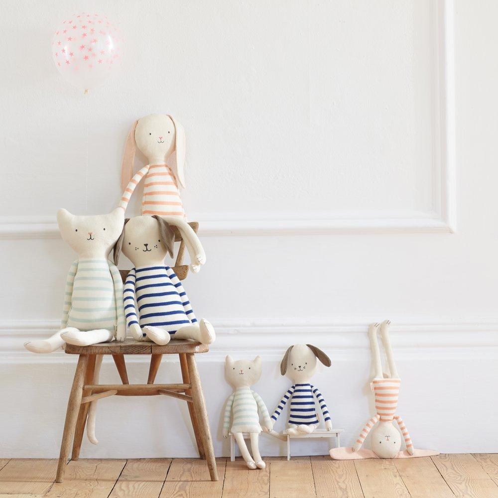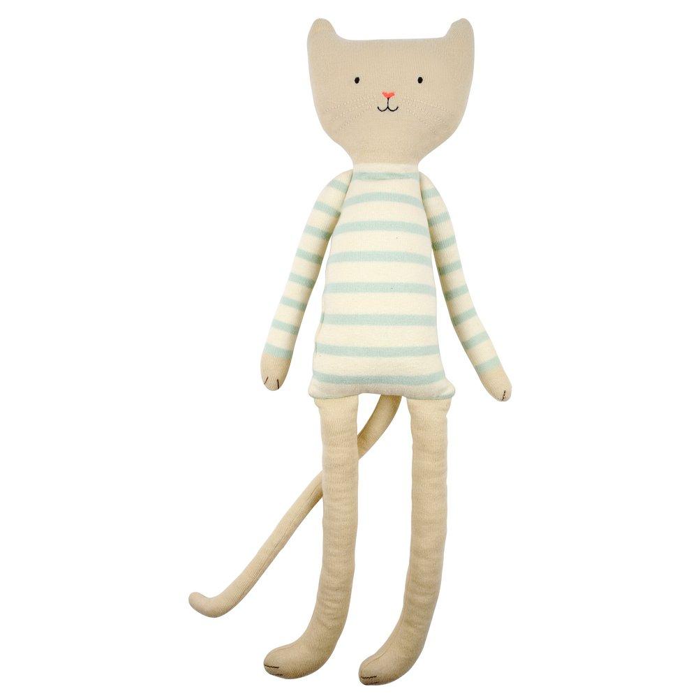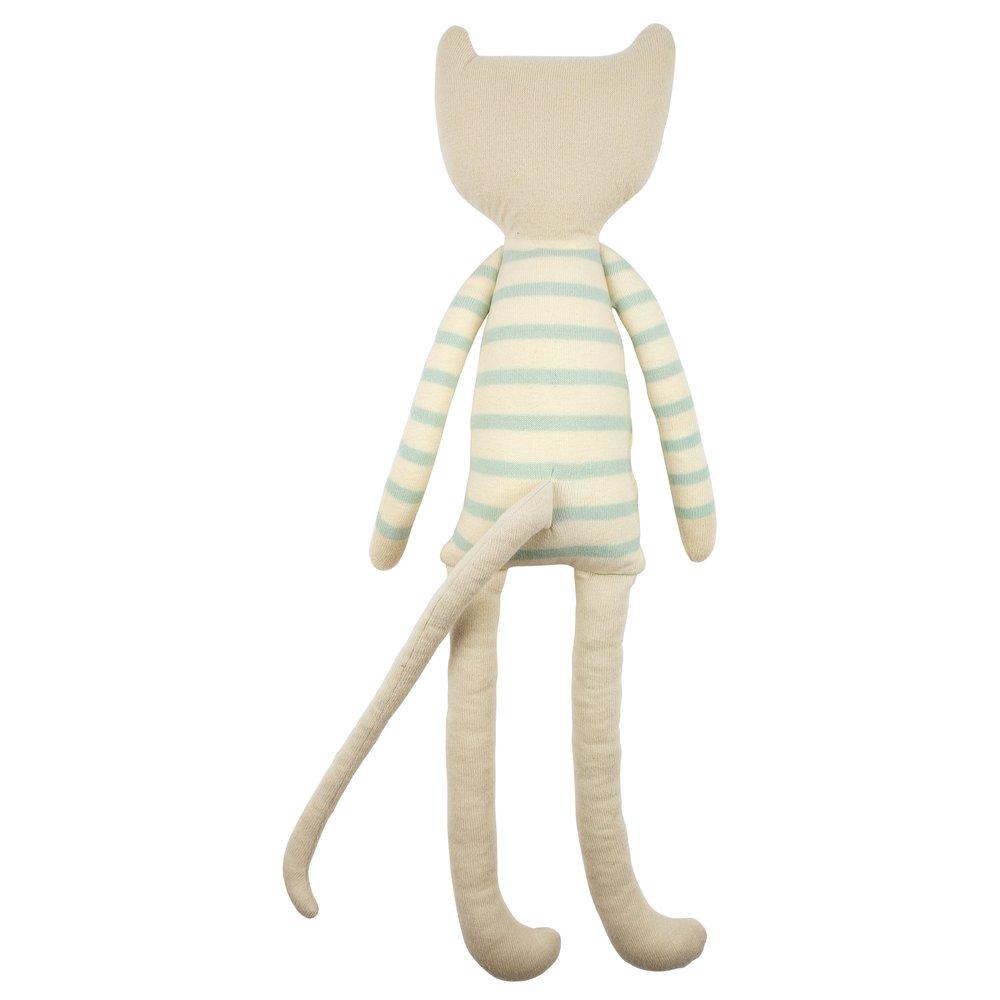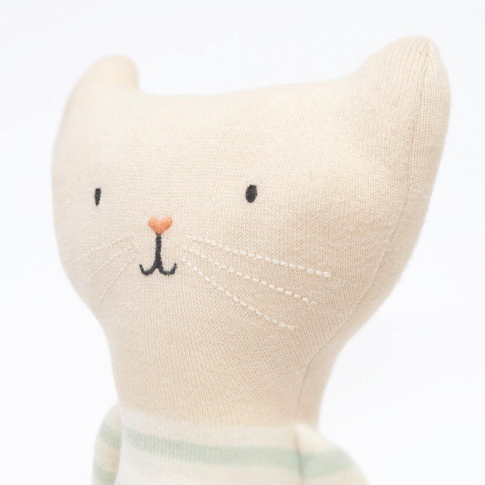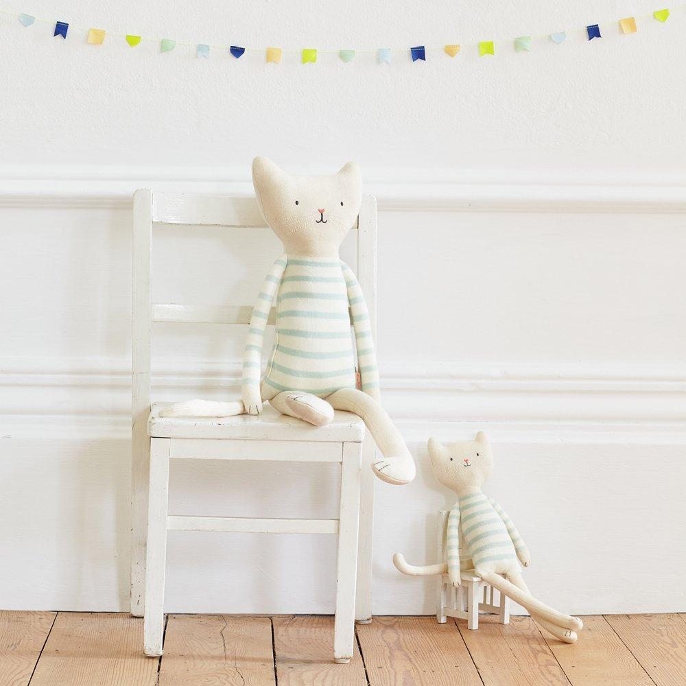 Chester the cat is the perfect companion for little ones who would love a cuddly feline friend. Beautifully made from knitted organic cotton with adorable stitched features, a sweet striped jumper, perky ears, and a long tail.