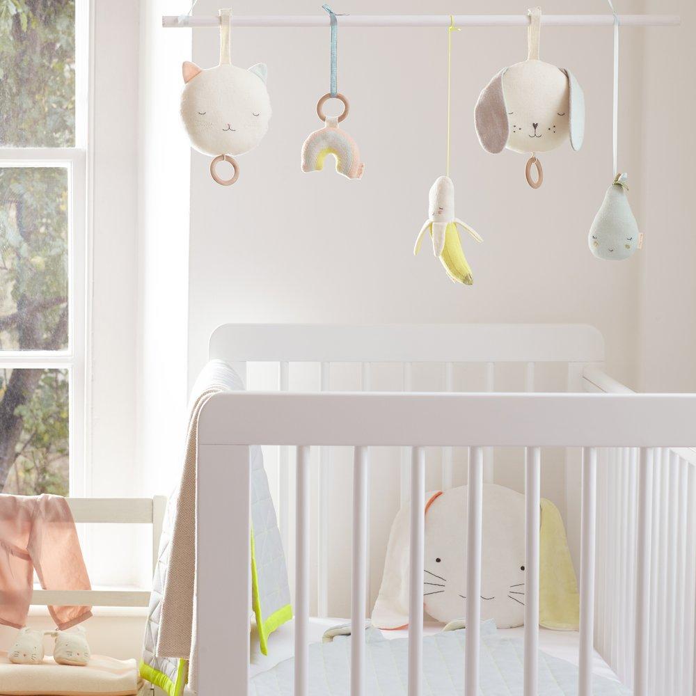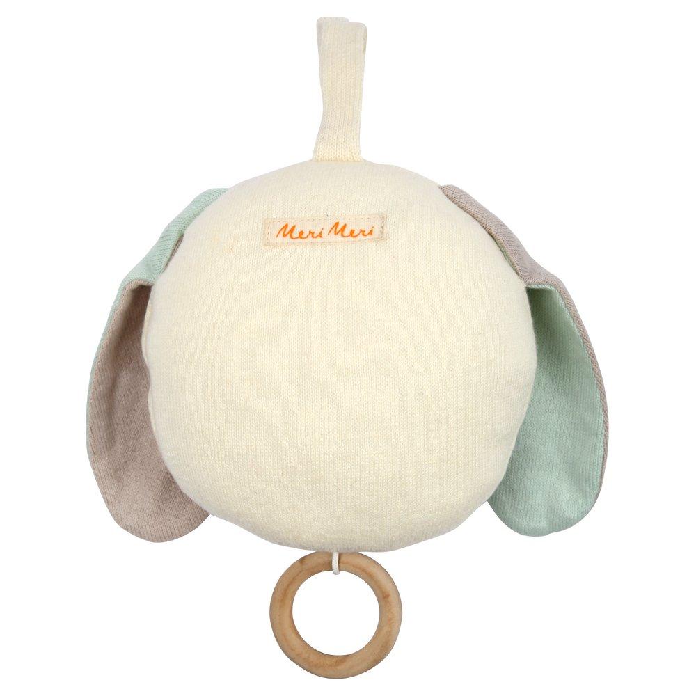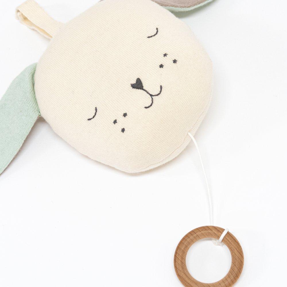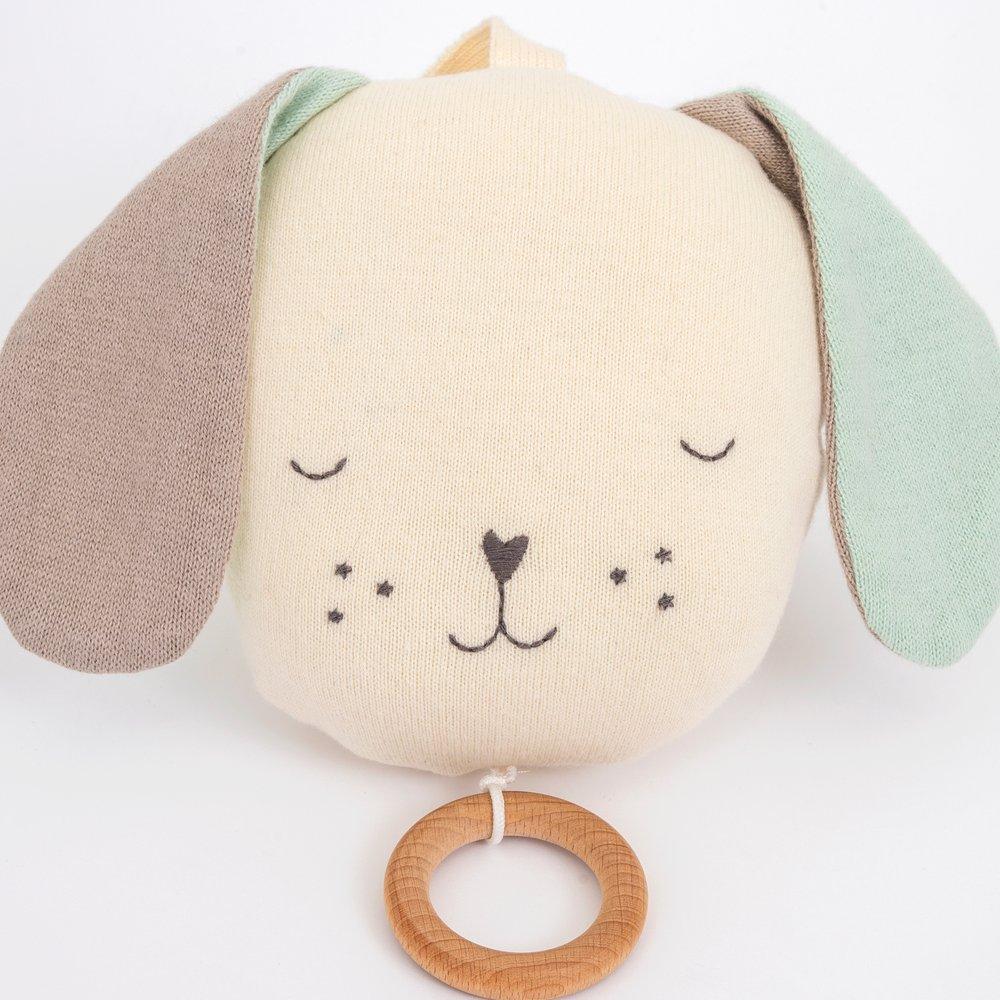 This knitted organic cotton musical dog toy is the perfect way to soothe a little one. Simply pull the smooth wooden ring to play the delightful tune. Beautifully crafted with charming embroidered features and adorable floppy ears.