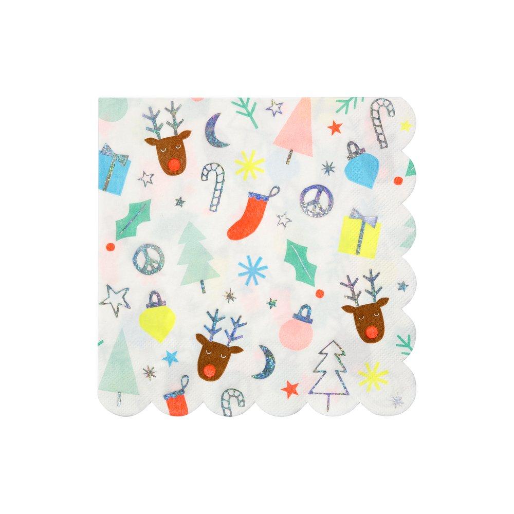 Spread some extra festive cheer at the table with these charming napkins. Featuring reindeer, stars, moons, Christmas stockings and decorations in a sparkle of bright colour and lots of shimmering silver foil detail. Beautifully finished with a stylish scallop edge.