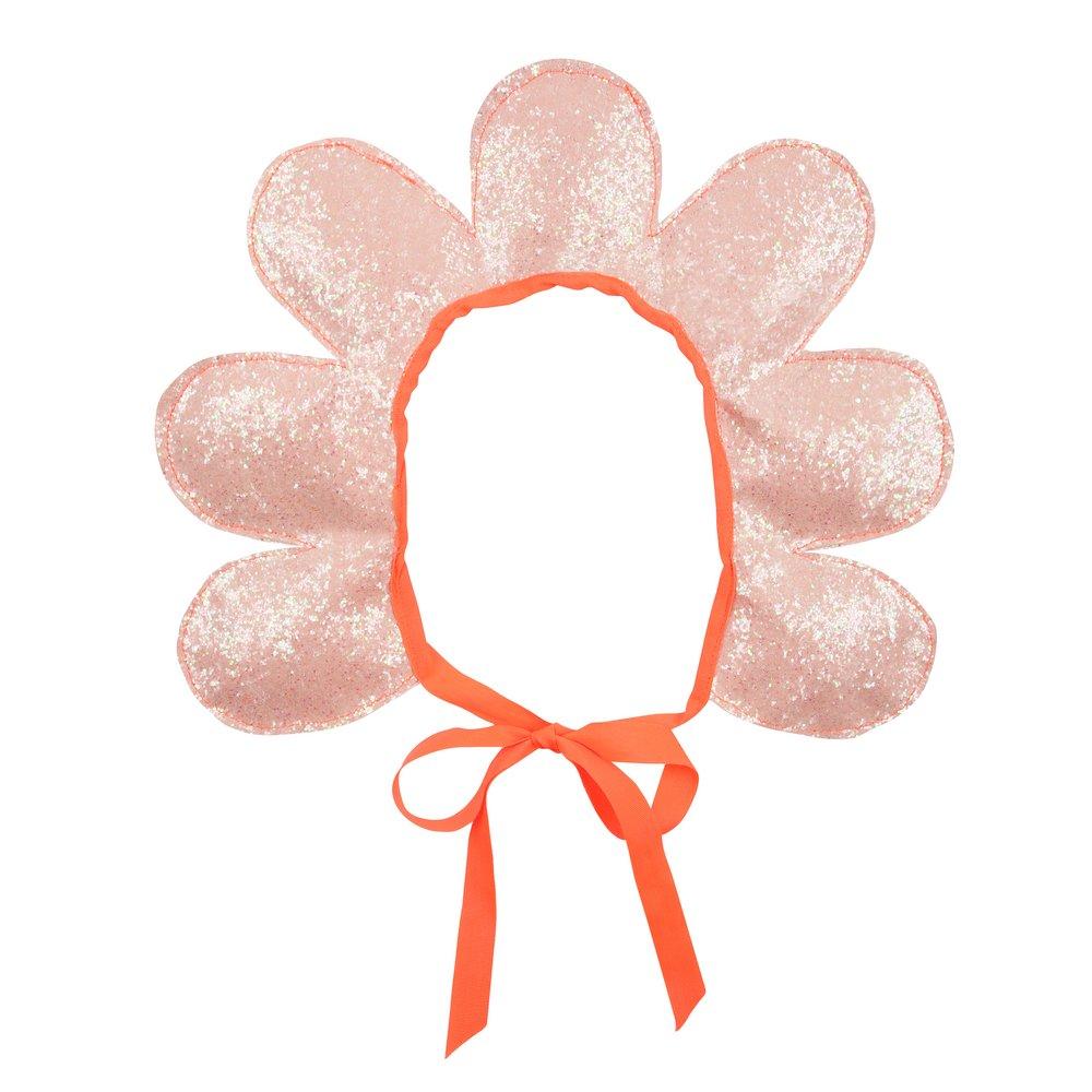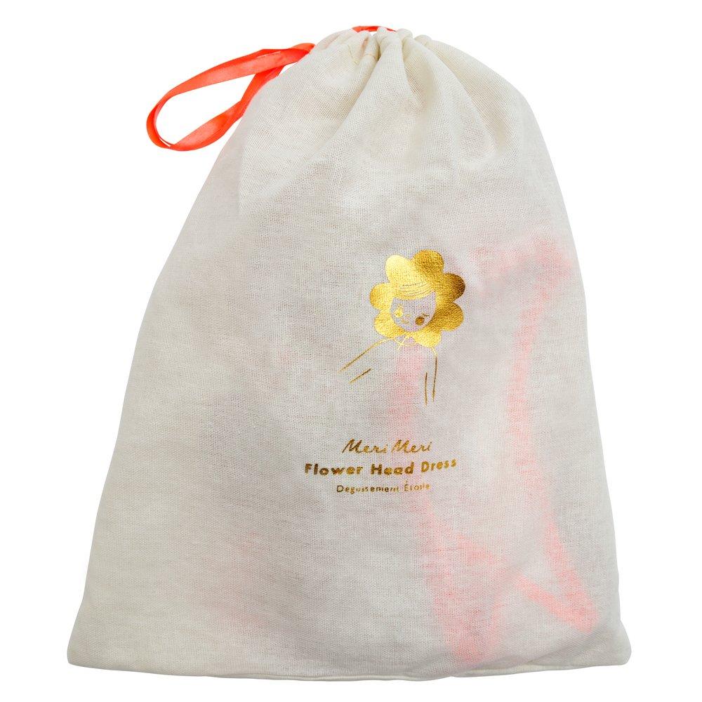 This beautiful flower headdress has pink glitter petals and a coral ribbon tie. The perfect gift for little ones who love to dress up. Presented in a stylish drawstring bag.