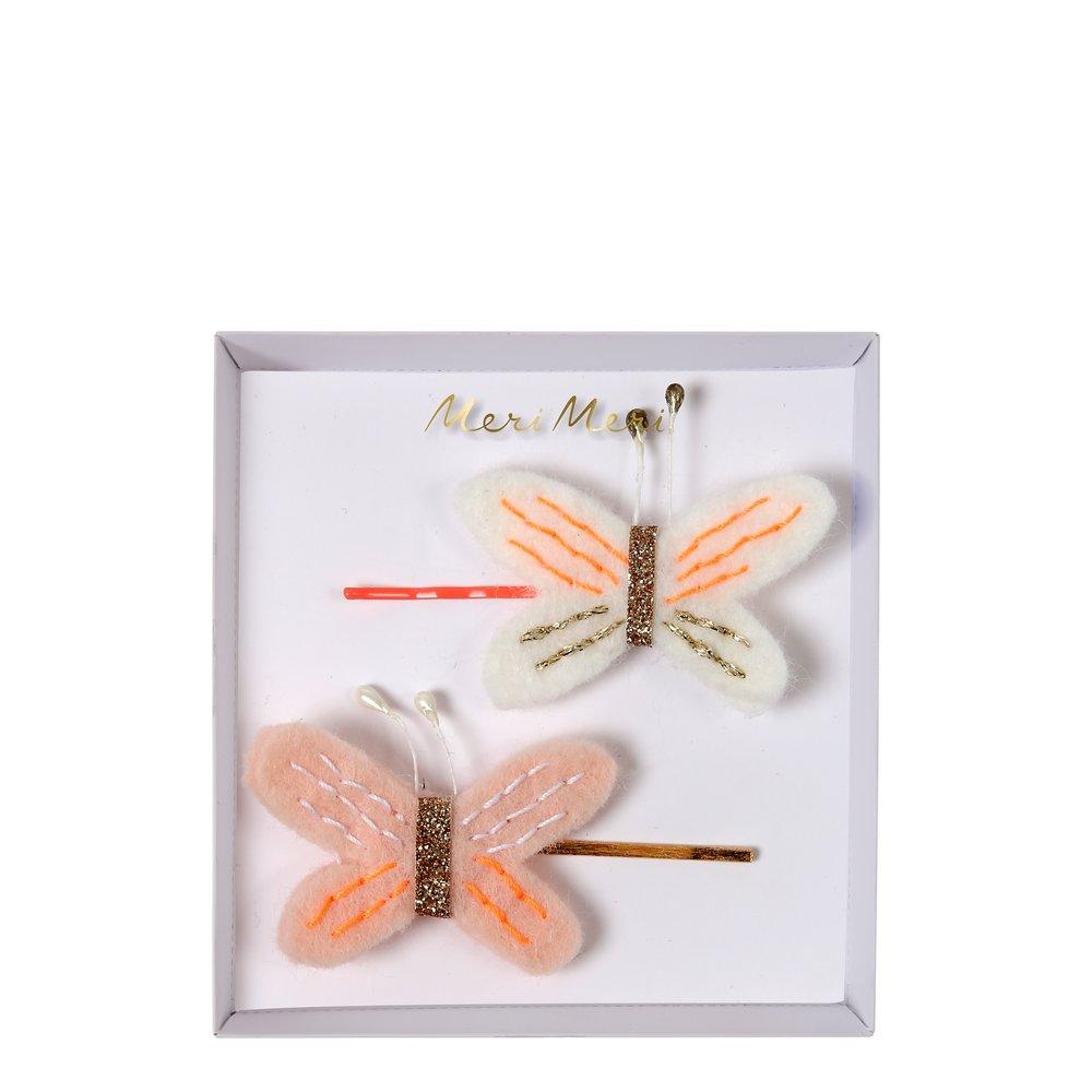 For a special occasion, add some extra embellishment to your hair with these beautiful butterfly hair slides. Crafted from felt and embroidered with shimmering gold details.