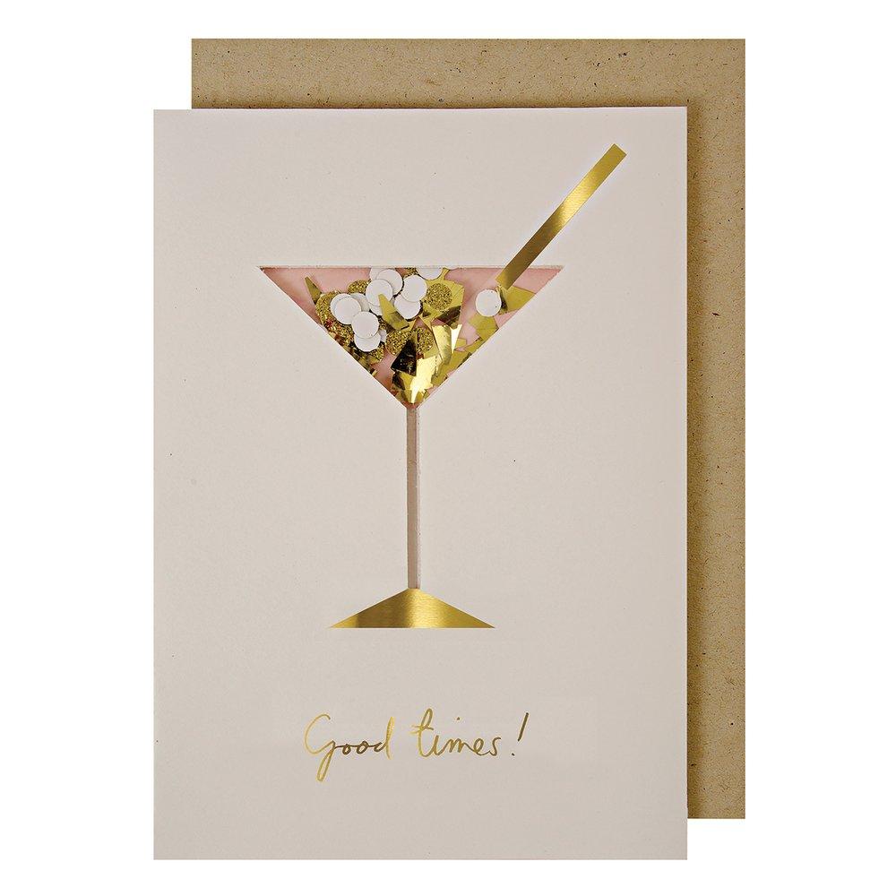 Raise a glass to the birthday girl or boy with this stylish birthday card. The classy cocktail glass is filled with confetti and shiny sequins and is embellished with gold foil. Comes with a coordinating envelope.