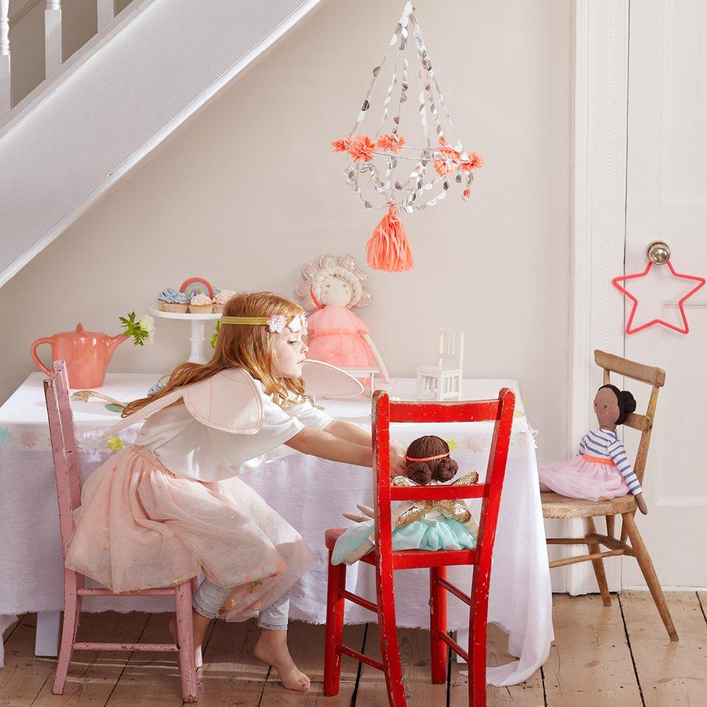 No dress-up box is complete without a set of wings, and these are sure to delight any little fairy! Made from beautiful peach cotton and featuring elegant stitched details. These wings are attached with gold elastic arm straps, making them perfect for any adventure. As a finishing touch, this dress-up set also comes with a brilliant flower headband and a drawstring storage bag.