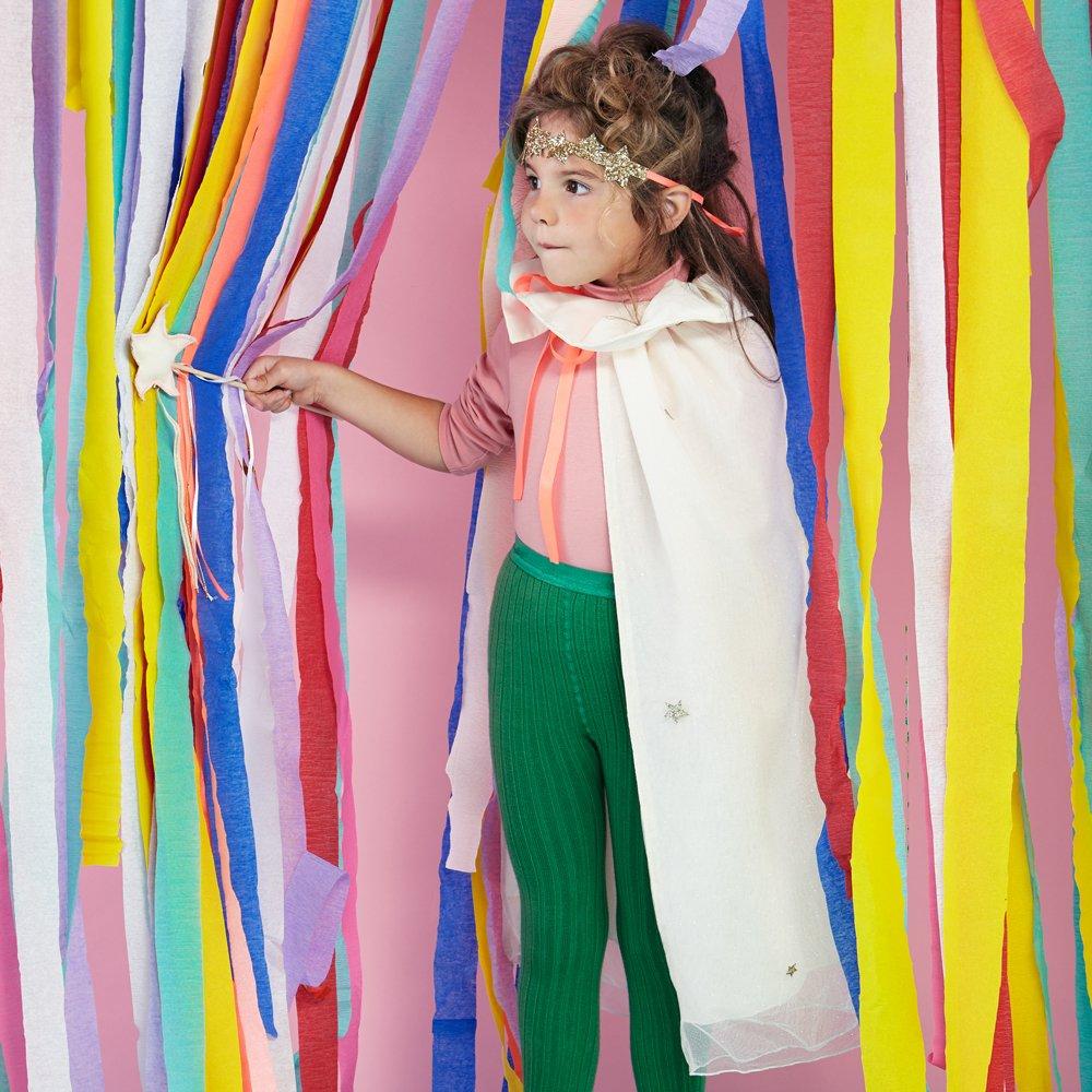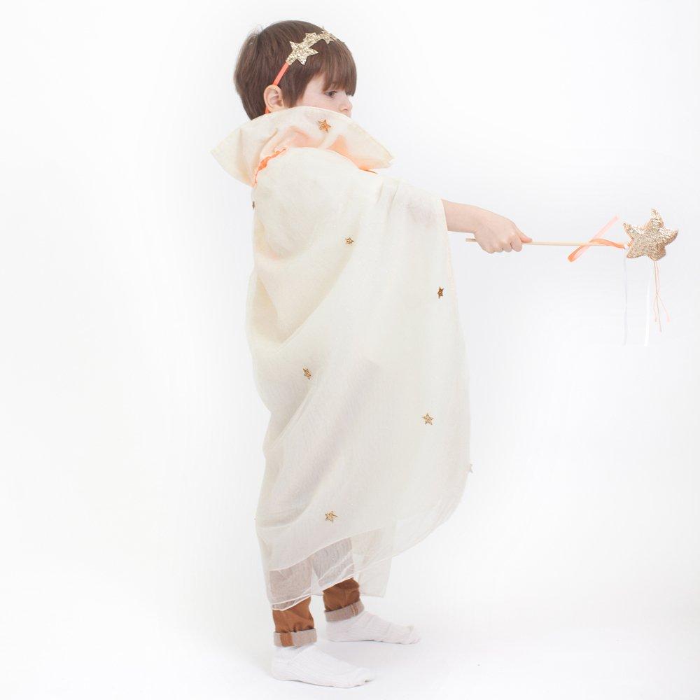 This luxurious glitter princess dress-up kit is the perfect gift for little ones who love magical occasions. It features a cape made from lined net with glittering gold stars and a matching headband and wand bedecked with gold stars and ribbons.