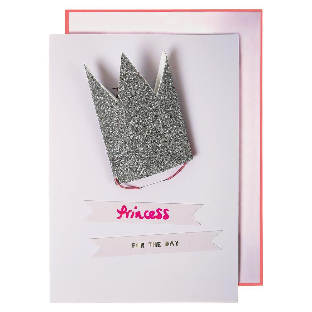 This is a beautiful card that is also a glittery gift! It features a stunning wearable silver crown with pink elastic chin strap. Comes with a coordinating envelope with a printed border.