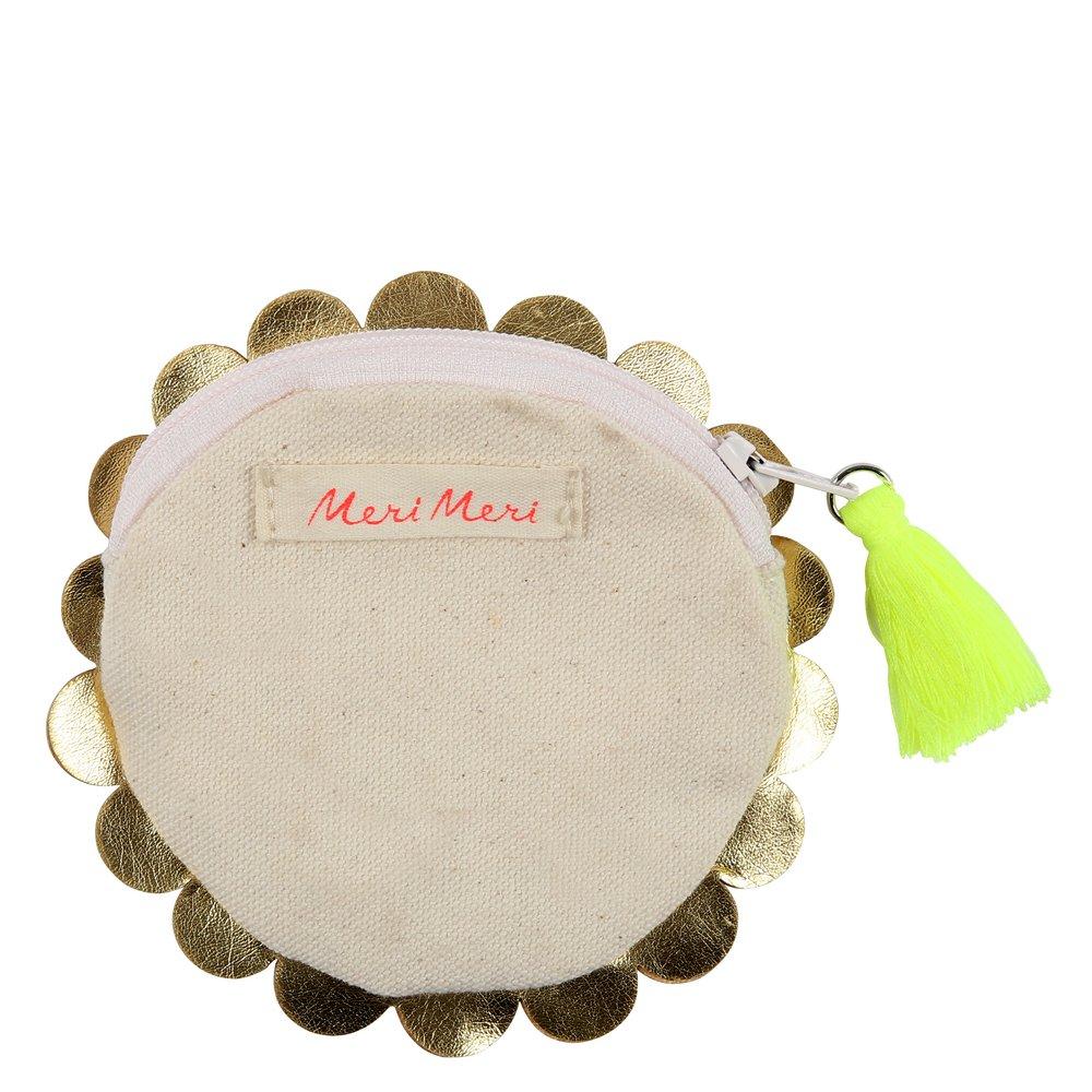 This totally wild pouch, in the shape of a lion's face, is beautifully decorated with a shiny gold leatherette mane, a sweet gold foil face, and a neon pink zipper with an attached neon yellow tassel. Crafted from lined canvas, it's perfect for storing precious little items in.