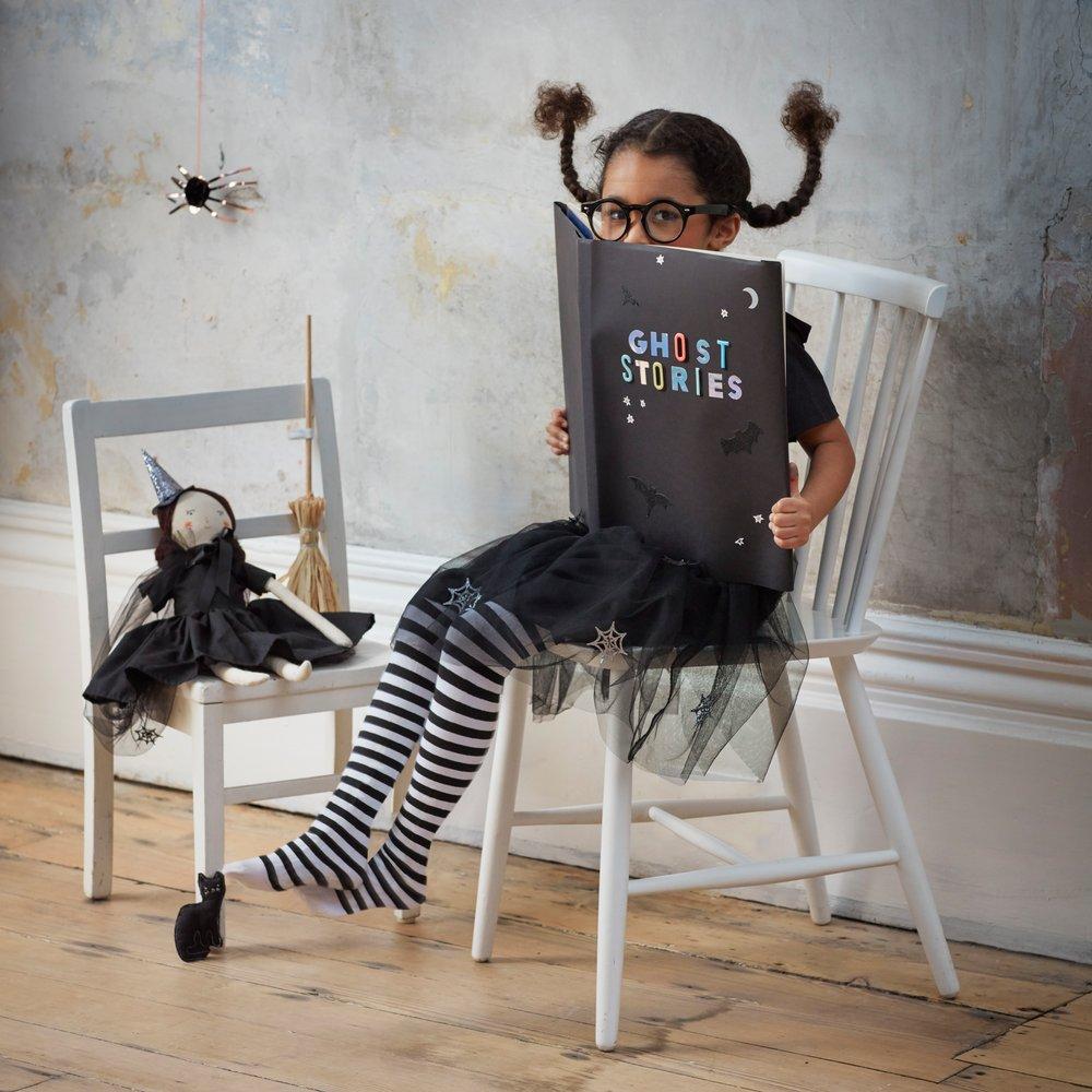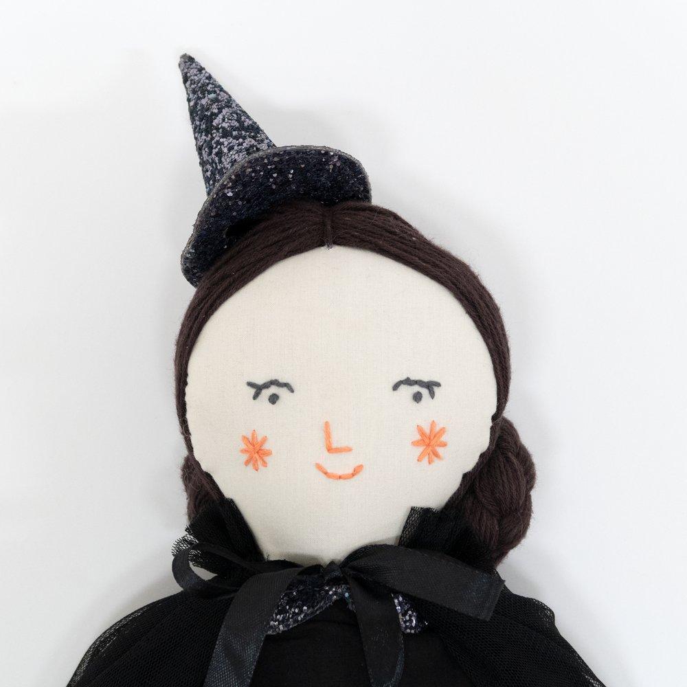 Here we have the delightful Luna, the smiliest witch in town. She is dressed in a black dress and tulle cape embellished with glitter cobwebs. She comes with a little silver glittery hat (which is a hair clip that children can wear too!), and a broom for make-believe flying through the skies! She makes a fantastic gift, especially for Halloween.