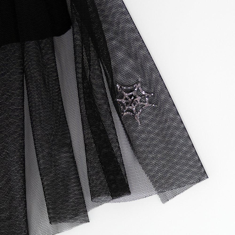 • She is dressed in a black dress and tulle cape with glitter cobwebs