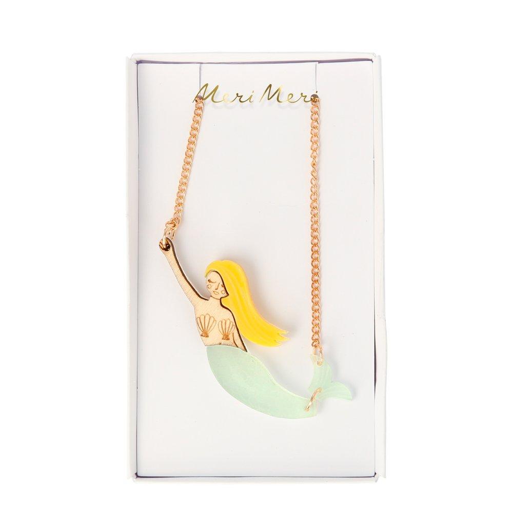 Little ones love mermaids, they are so beautiful and magical. So this necklace is perfect as a gift. Featuring a mermaid pendant crafted from etched wood and acrylic, with a shimmering gold tone chain.