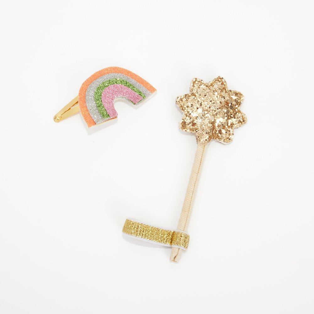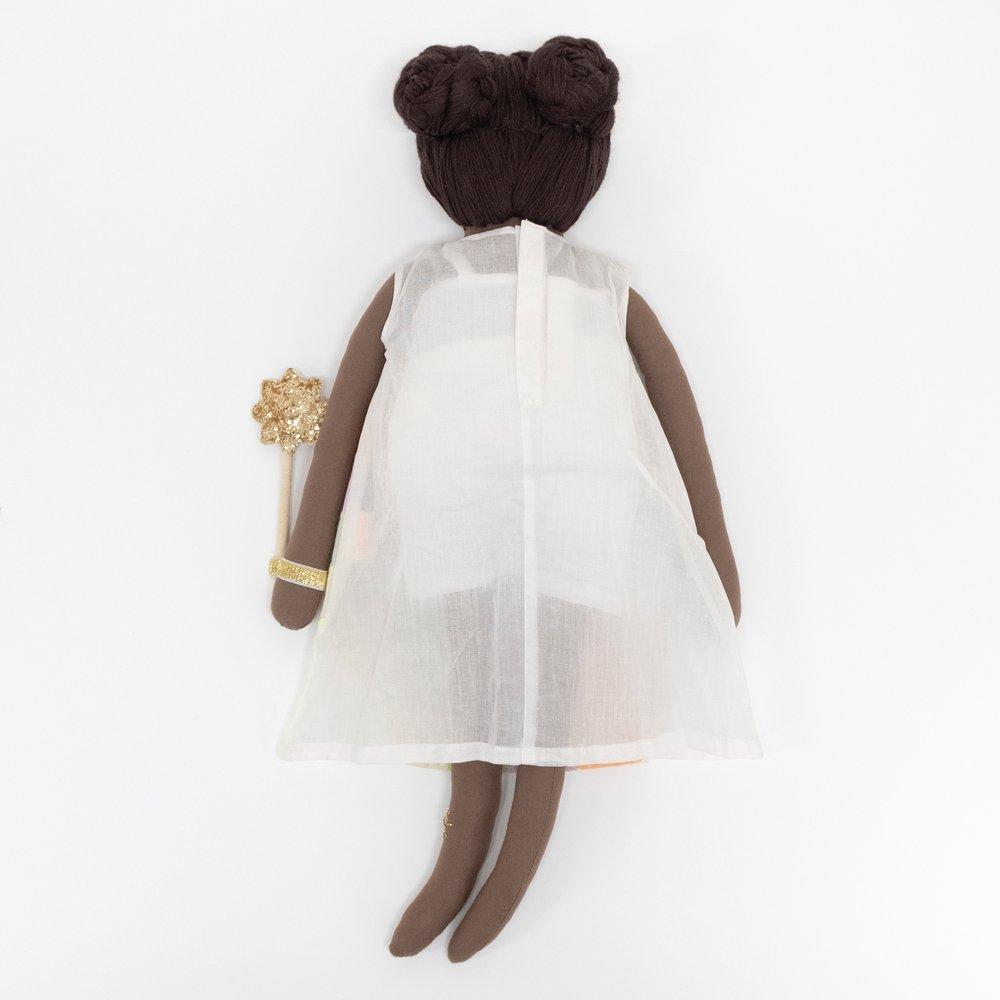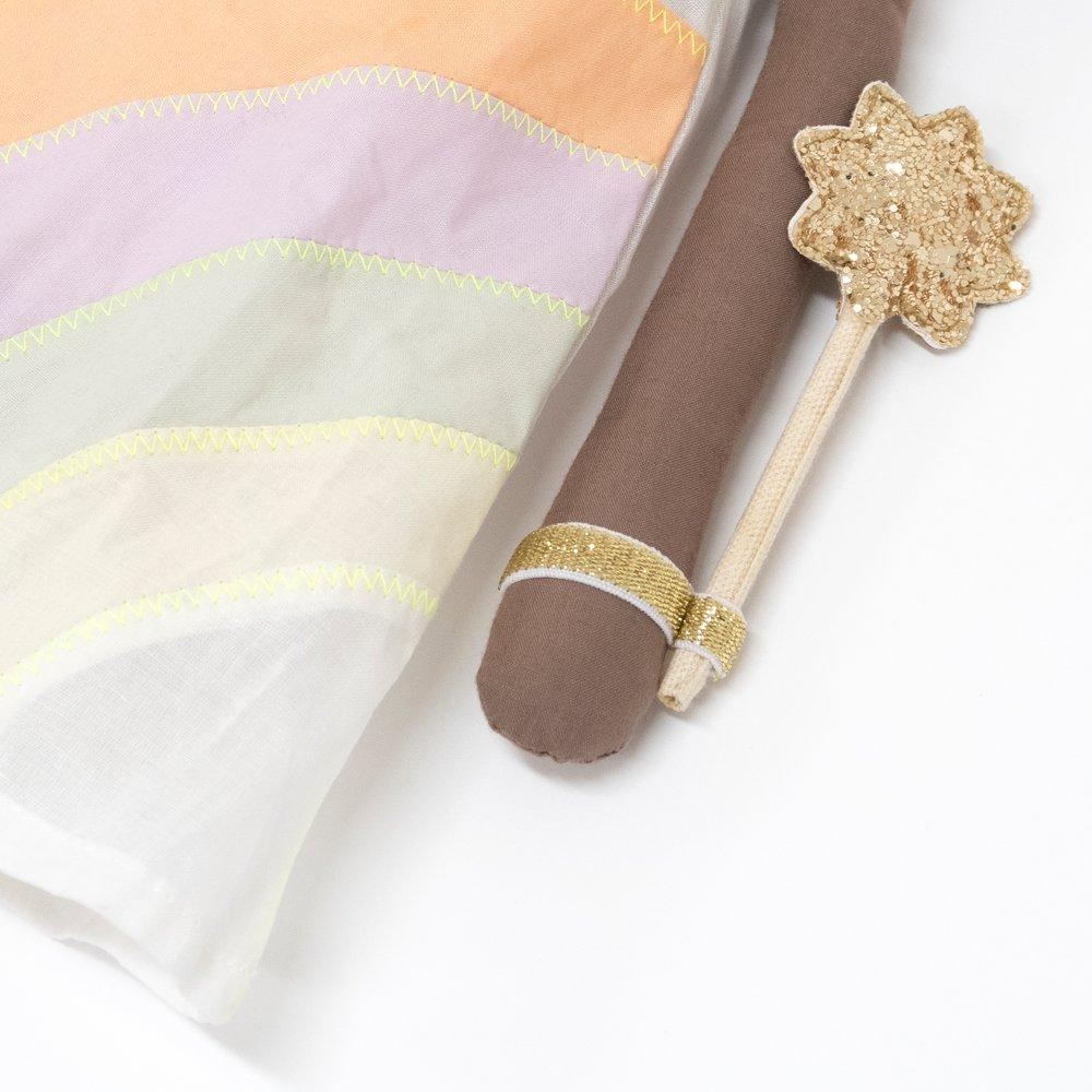 This is Mia, one of the Meri Meri classic fabric doll family. She's soft and huggable and little people will just love to take her on adventures. She's beautifully crafted from calico, with brown yarn hair and sweet embroidered features. Mia is stylishly outfitted in a pretty dress with a gorgeous rainbow embellishment, but she can easily be undressed and re-outfitted in any of our dress-up kits. Her hair is adorned with a glittery rainbow hair clip and she has a stunning sun wand.