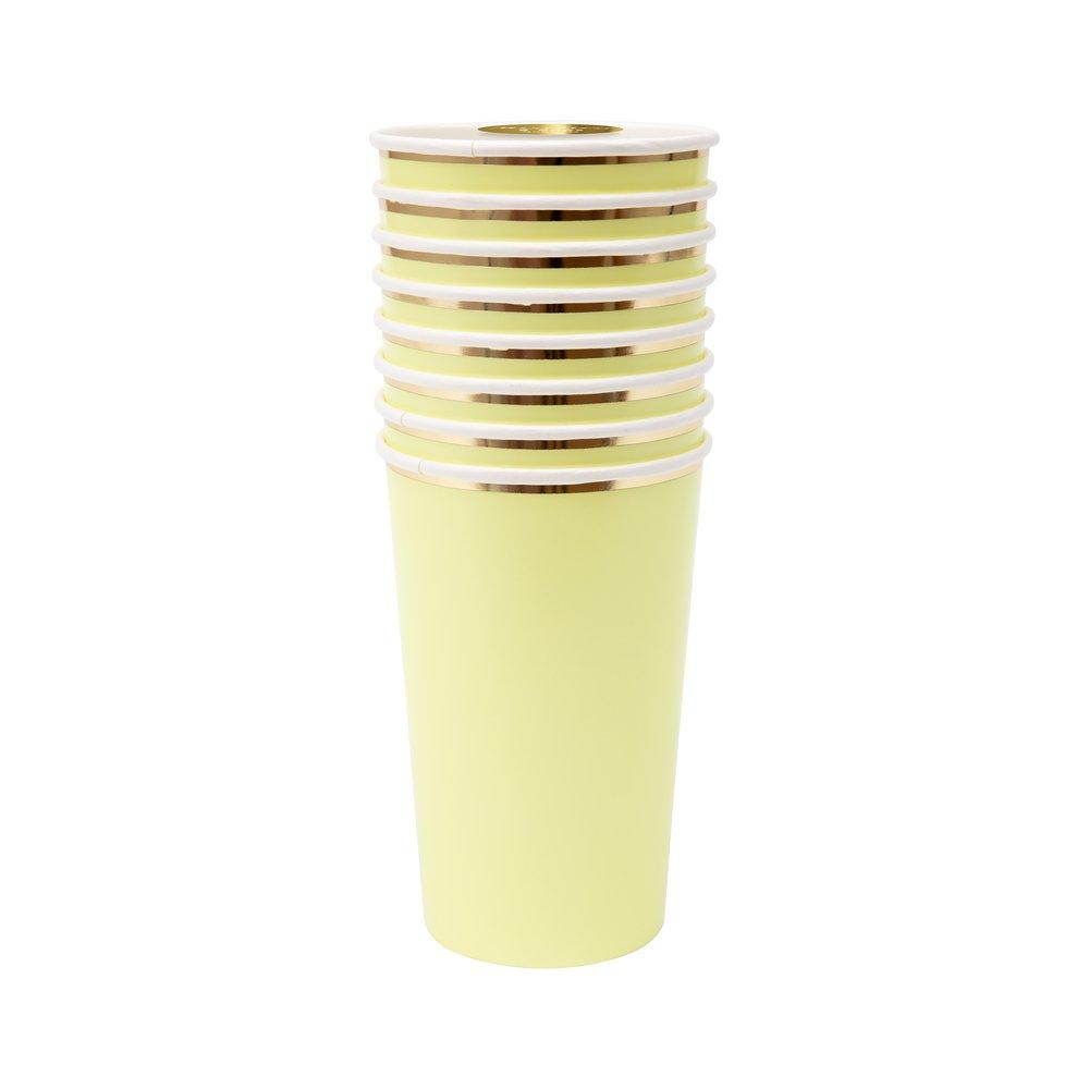 Your guests will love to enjoy a refreshing drink from these beautiful pale yellow highball cups with a stunning gold foil border. Made from high-quality card with a superb gloss finish, suitable for hot or cold drinks.