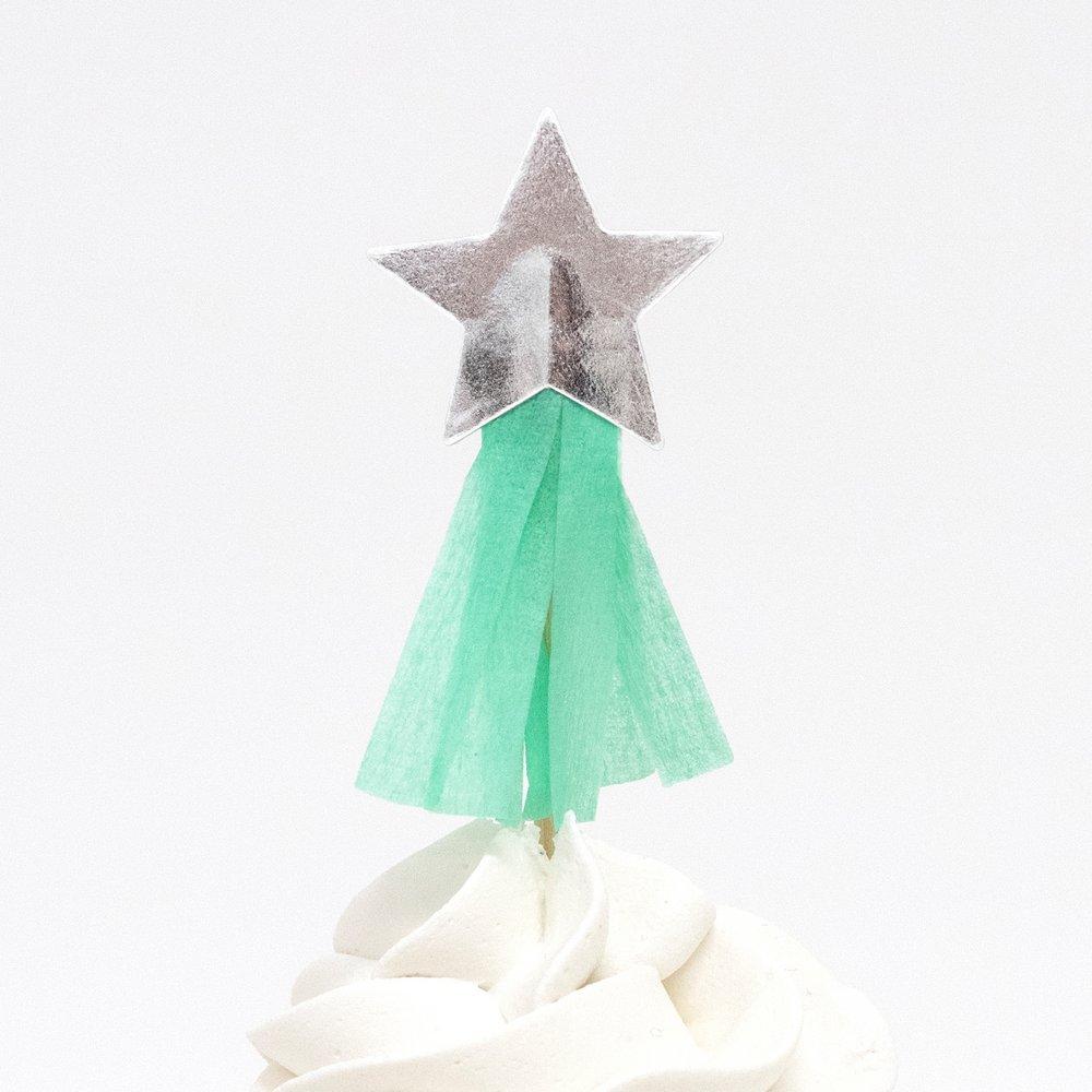 - The toppers are crafted from paper and crepe paper, with silver foil and ribbon embellishments