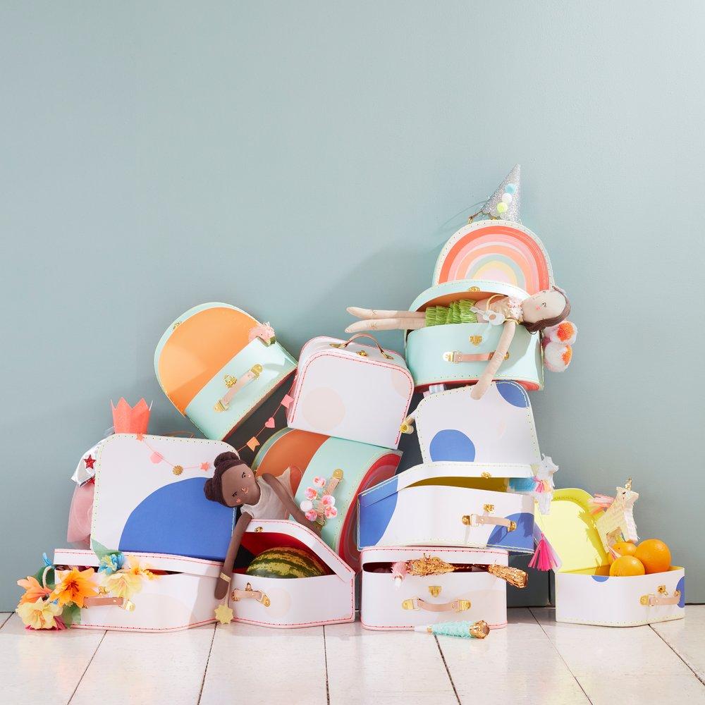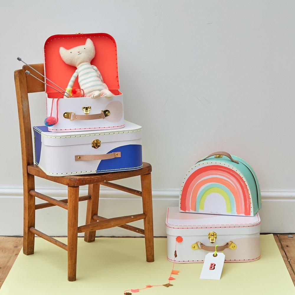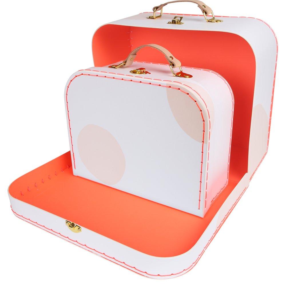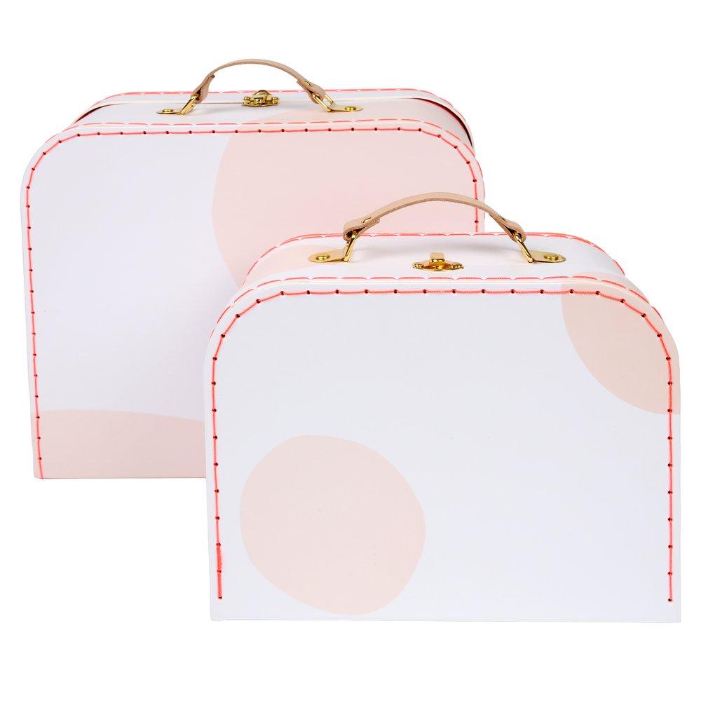 Little ones who love to head off on adventures will adore this beautiful set of suitcases, perfect to fill with journey essentials. Made from laminated card, with leather handles and riveted fasteners, the spotty design and neon pink stitched details are sure to delight any traveler.