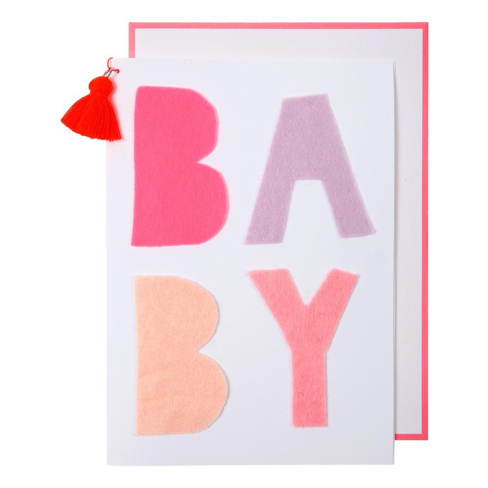 This bright and beautiful card is perfect to send love and congratulations to the new parents. Features a bold motif with the word 'Baby' crafted from coloured felt. Elegantly finished with a sweet little tassel. Comes with a coordinating envelope.