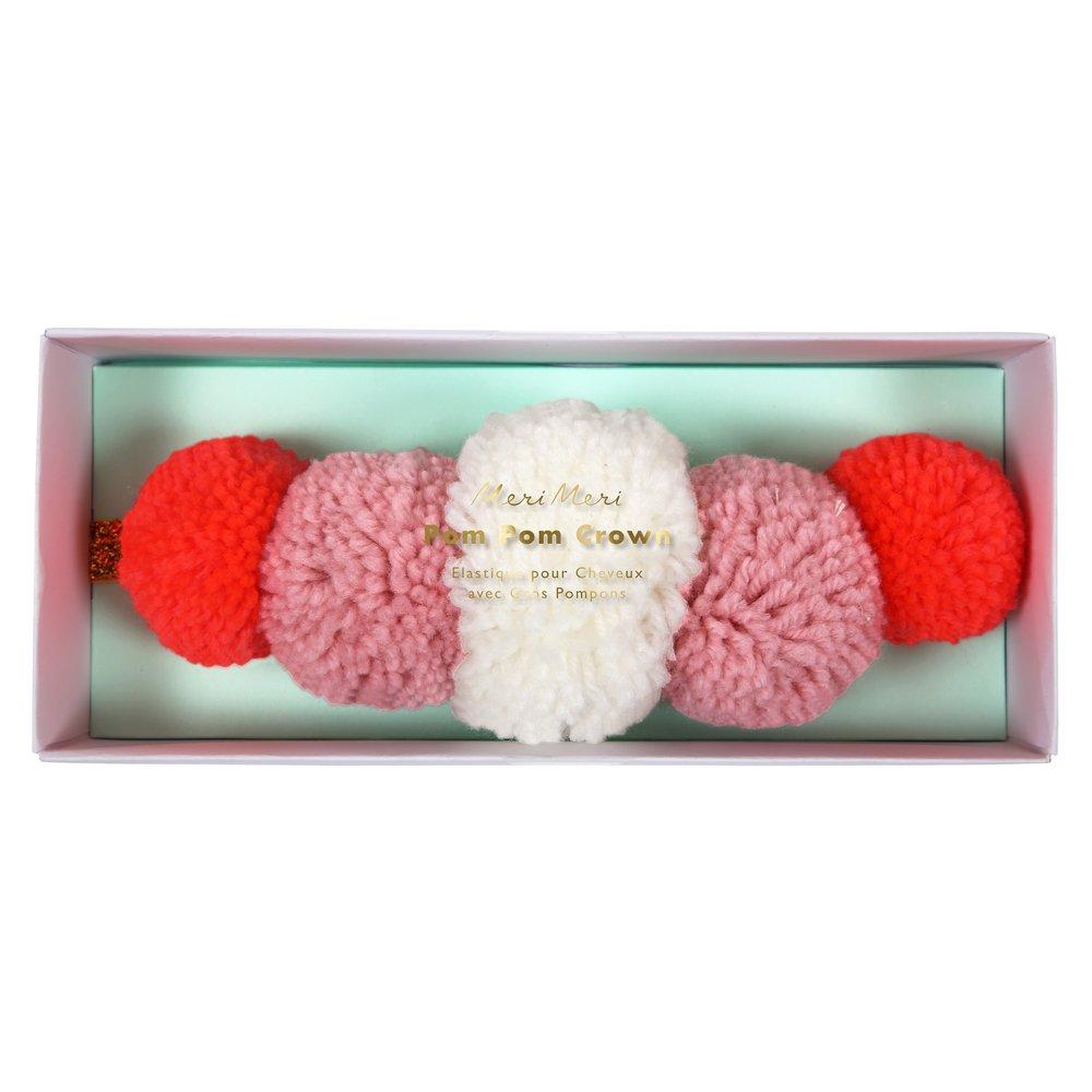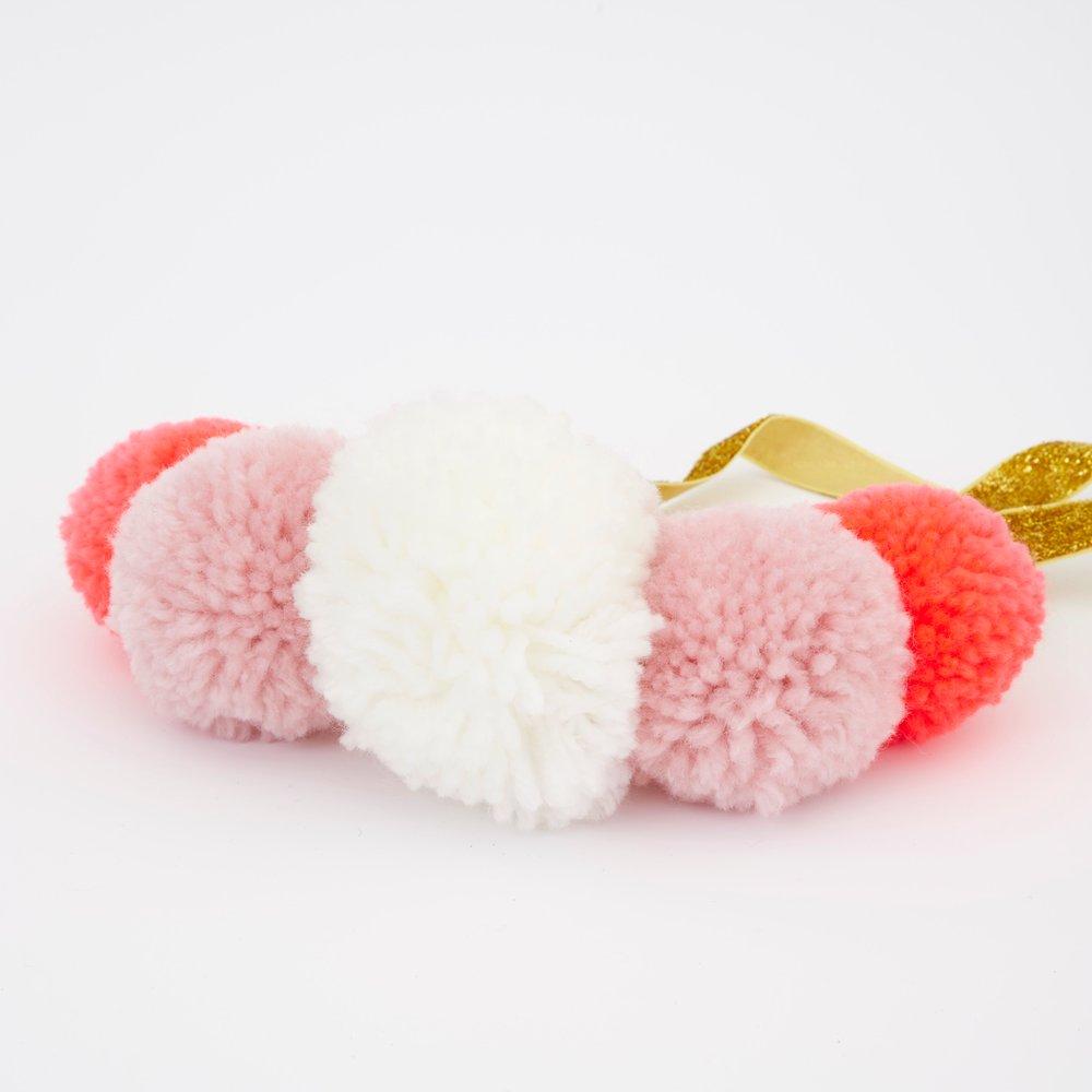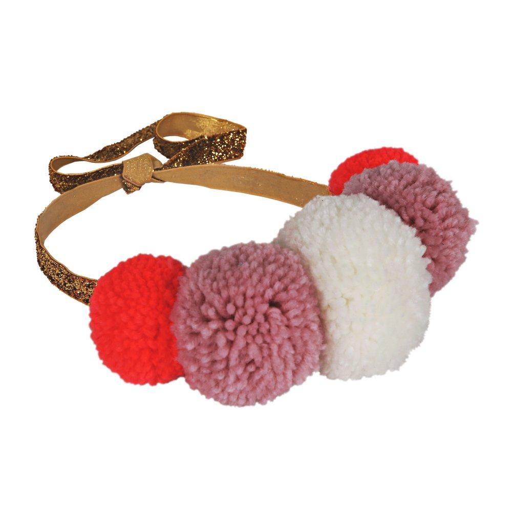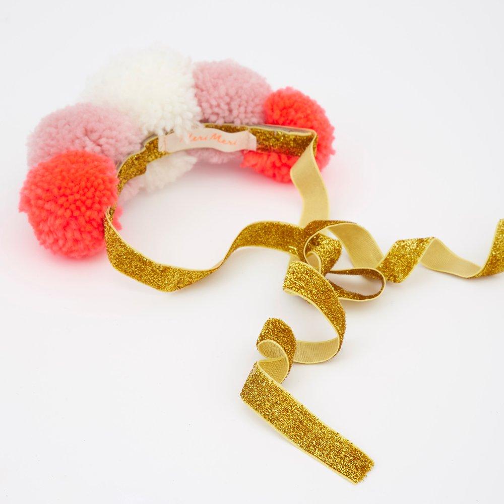 This quirky pompom headband, made from a gold glitter elastic band with a tie fastening, features five fluffy pompoms in stunning shades of pink, white and coral. It's sure to be the crowning glory of any dressing-up costume!