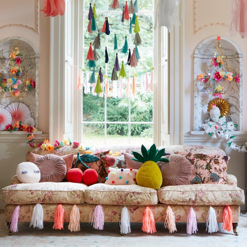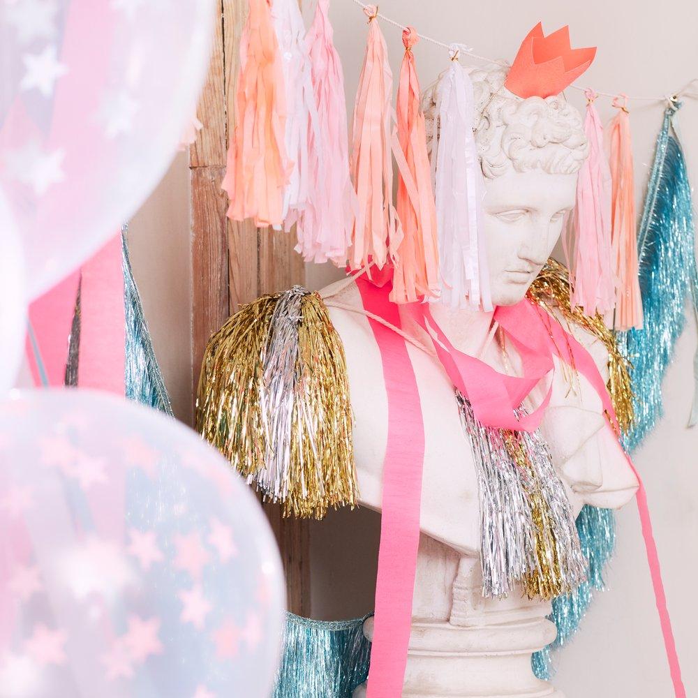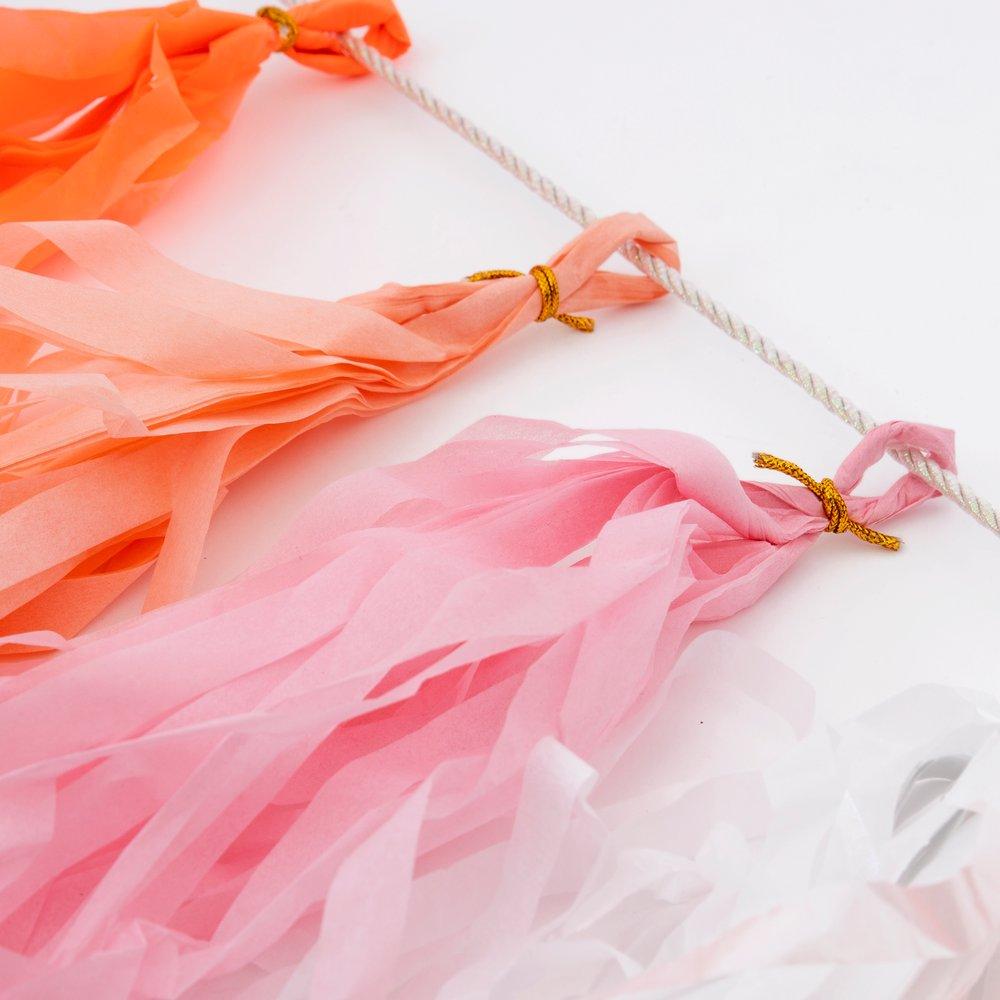 Brighten any room in seconds with this gorgeous garland. Features twelve funky tassels in four shades of pink, made from tissue paper and iridescent film. Pre-strung with iridescent cord.