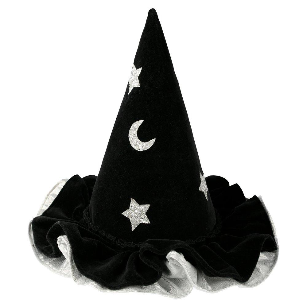 This witch's hat, with ruffle details, is very stylish indeed. It is crafted from black velvet, with silver lamé and silver glitter stars and moons. An essential accessory for Halloween, or to add to a dressing up box for imaginative play any time of the year.
