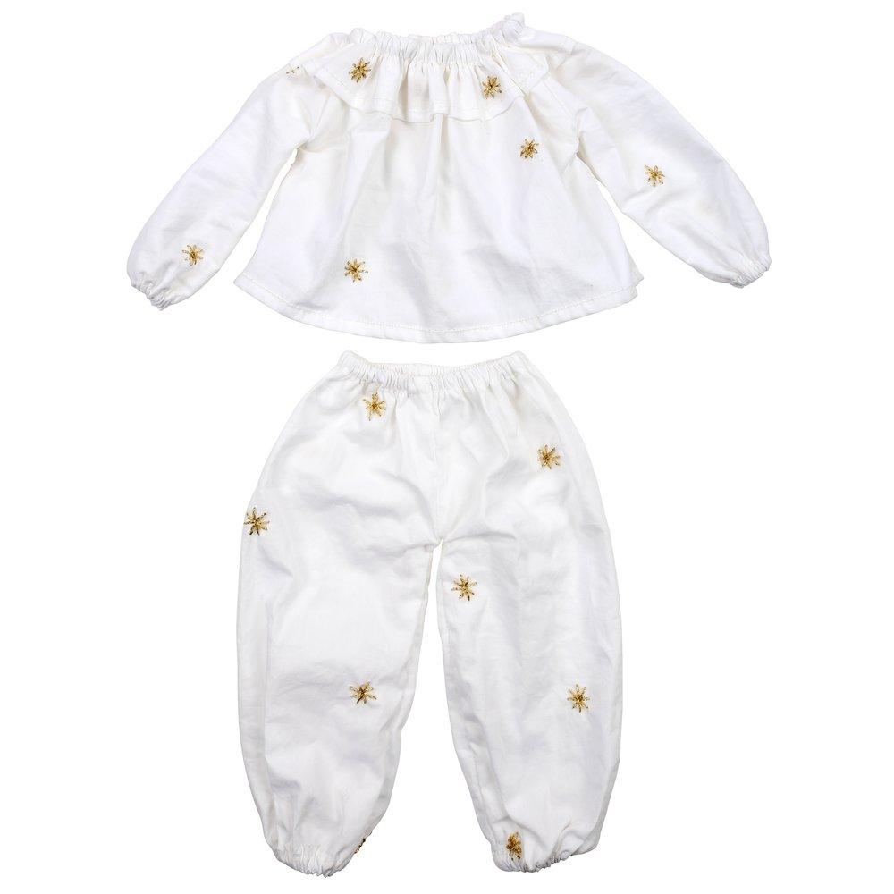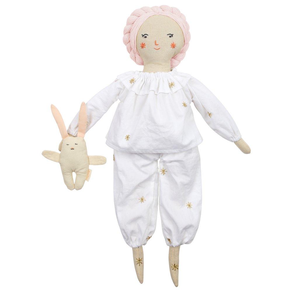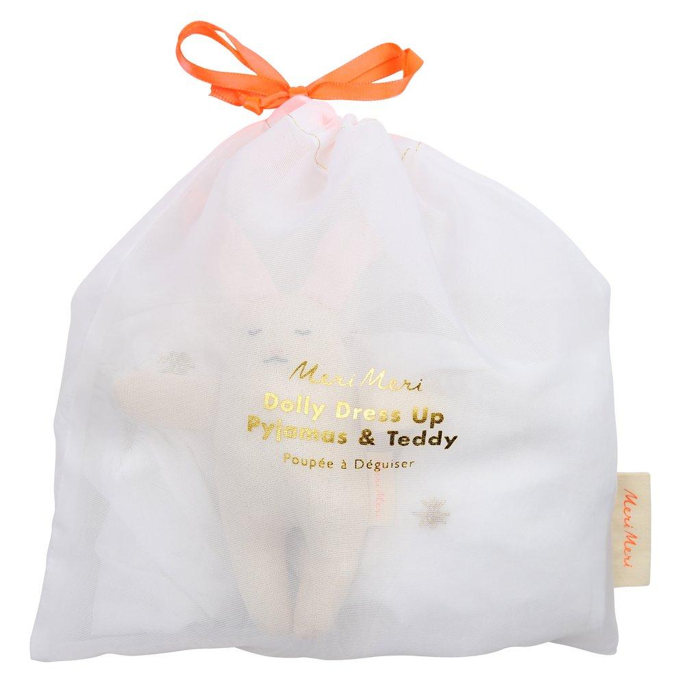 Playing dress-up with dolls is a fantastic way to let your little one's imagination run wild. This bedtime doll dress-up kit features a set of cotton PJs, beautifully decorated with gold embroidered stars, and a tiny cuddly bunny toy. Stylishly packaged in an organdie drawstring bag. (Please note, doll not included)