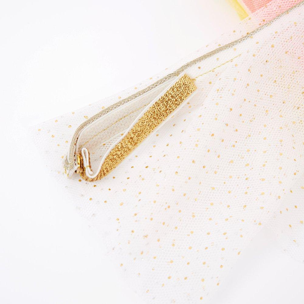 This gorgeous rainbow dress-up kit is perfect for a little one to transform into a beautiful fairy. The dress is made from layers of colourful tulle, for a spectacular effect, and has a polycotton lining. It has floaty layered tulle wings attached, with a glittery gold border. Comes with a wand, with a happy sun face, to cast magical spells.
