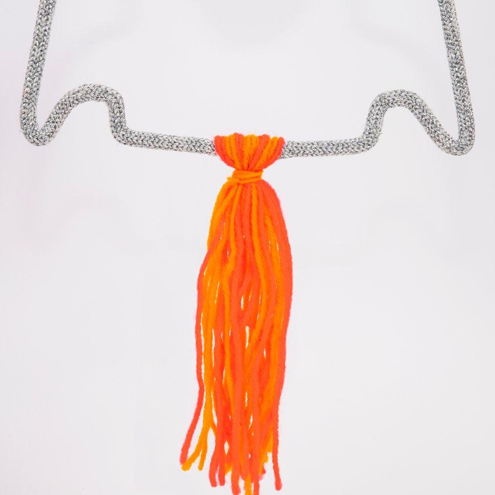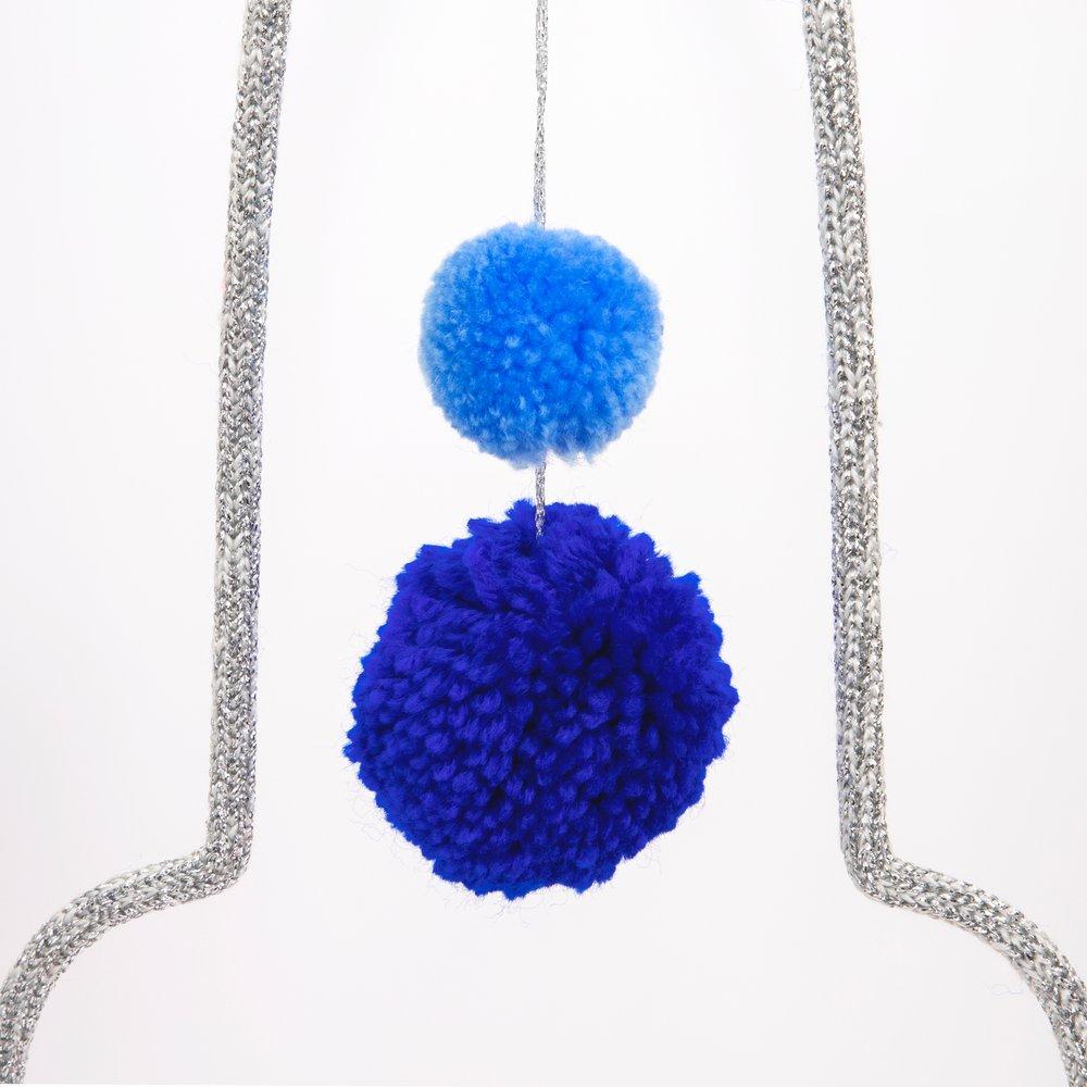This wonderful rocket mobile will look out-of-this-world in a little stargazer's room. Made from knitted silver wool on a wire frame, with two fun blue pompoms and orange yarn for fiery flames.