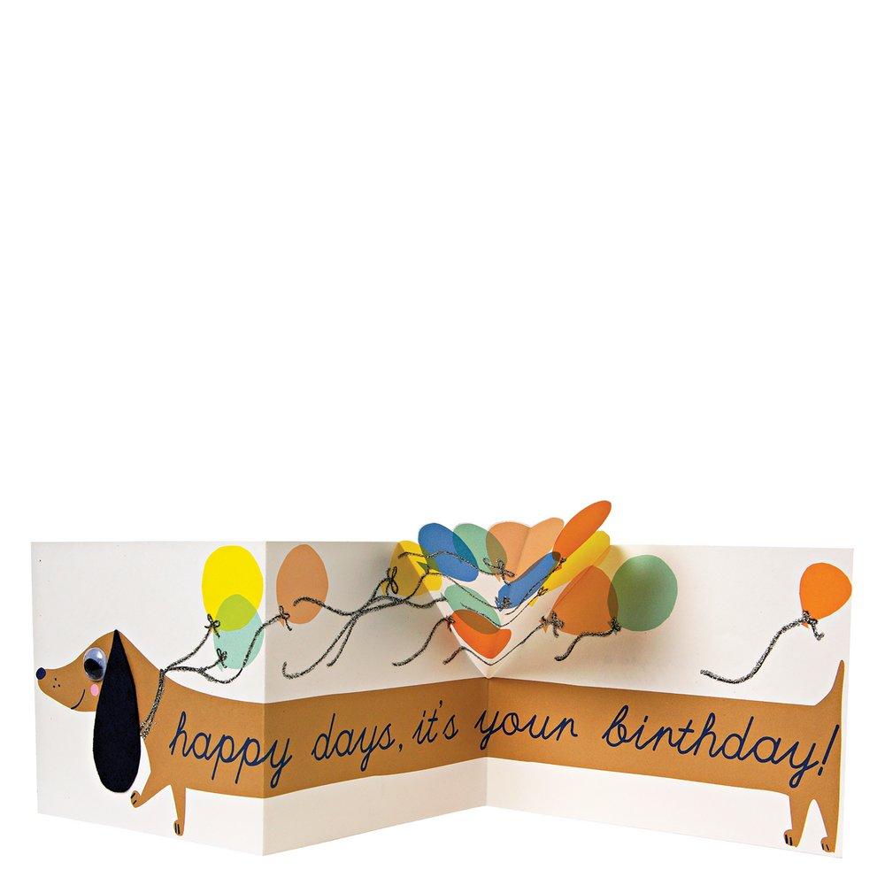 Put a smile on the birthday boy or girl's face with this clever fold-out card featuring an adorable sausage dog with a funny googly eye. Opens to reveal a birthday message and balloons beautifully embellished with shiny silver string. Comes with a coordinating stripy envelope.