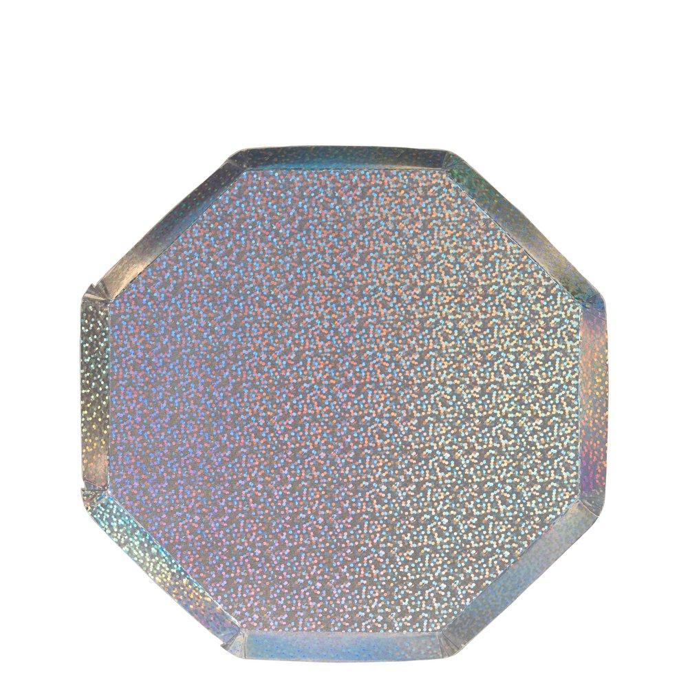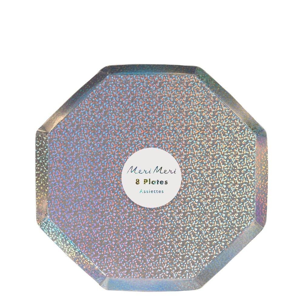 Add glitz and glamour to the party table with these sparkly silver side plates. Made with high-quality card with a superb gloss finish.