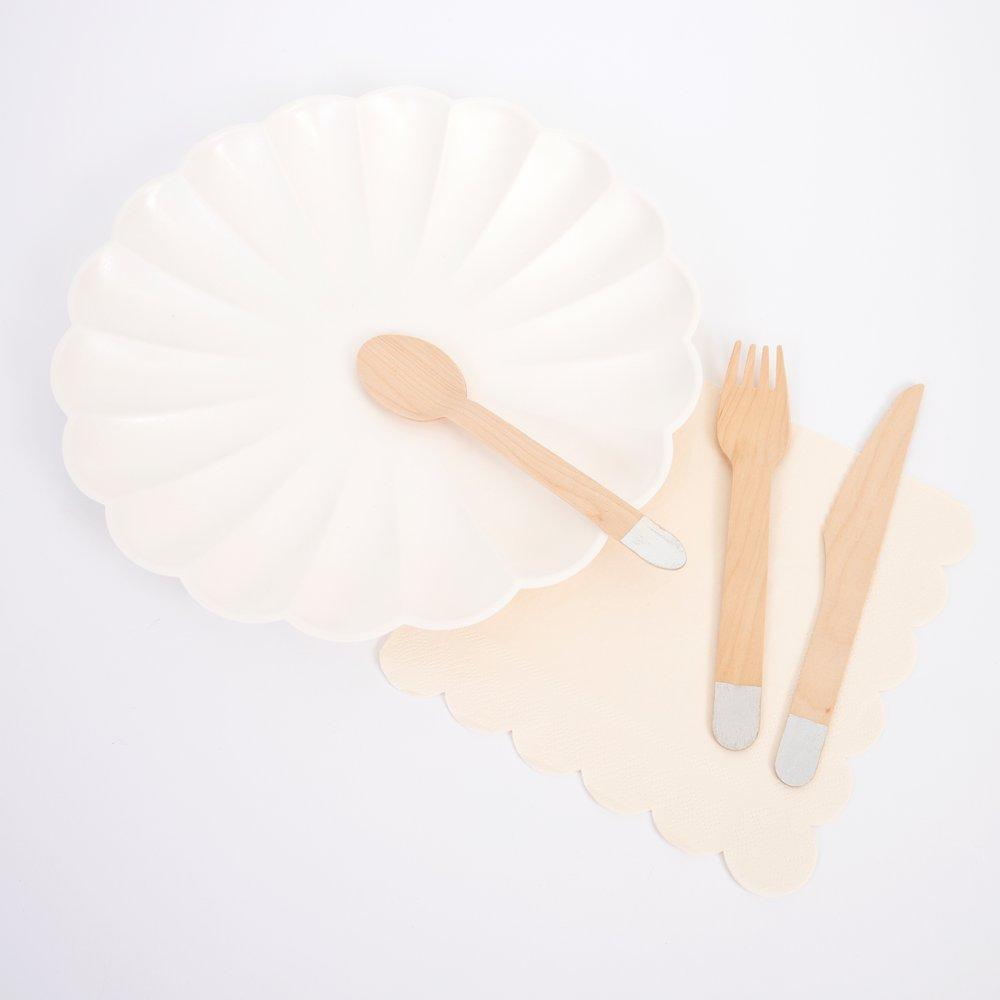Add pizzazz to any party or picnic with these high-quality knives, forks, and spoons. Beautifully crafted in pale birch wood and decorated with shiny silver foil handles.
