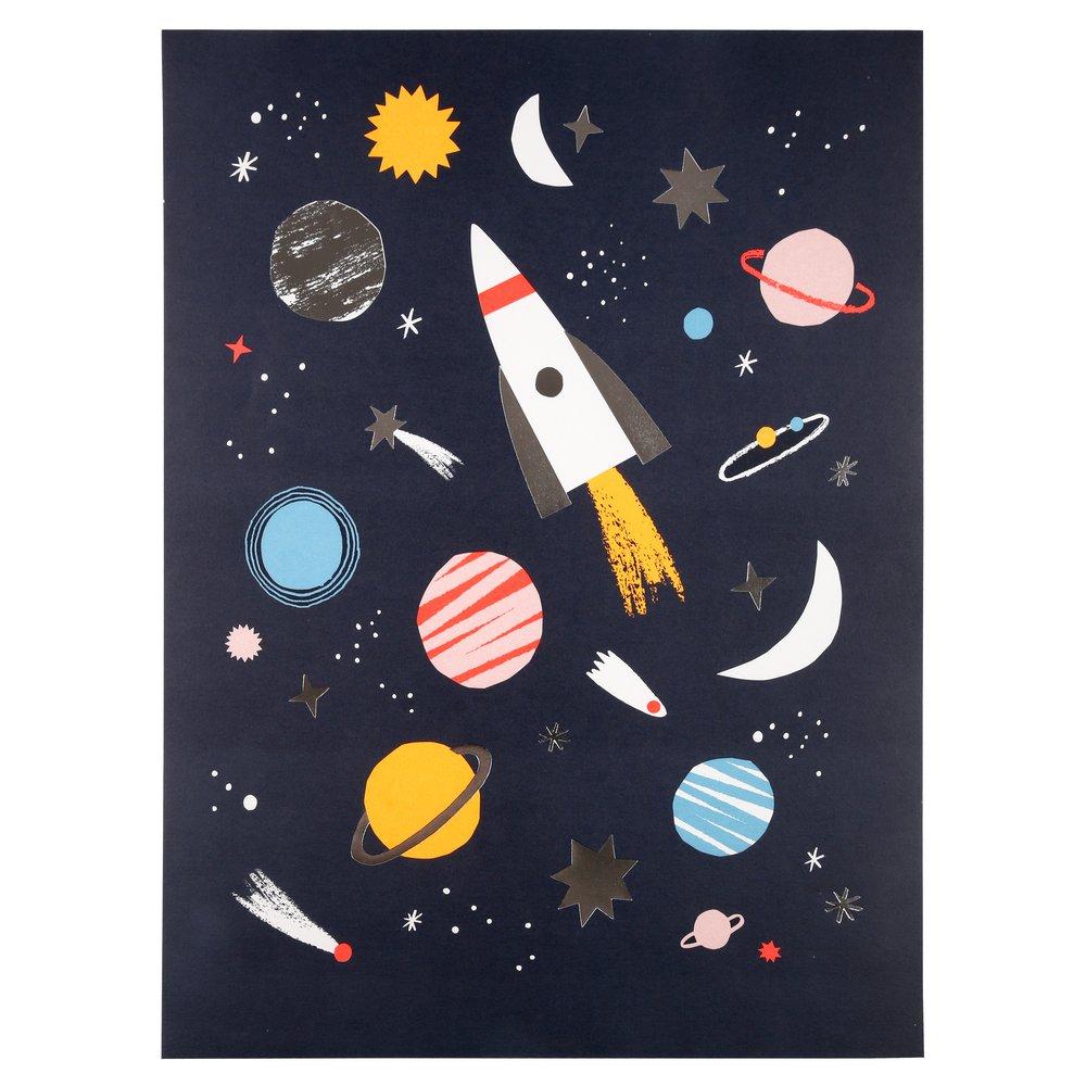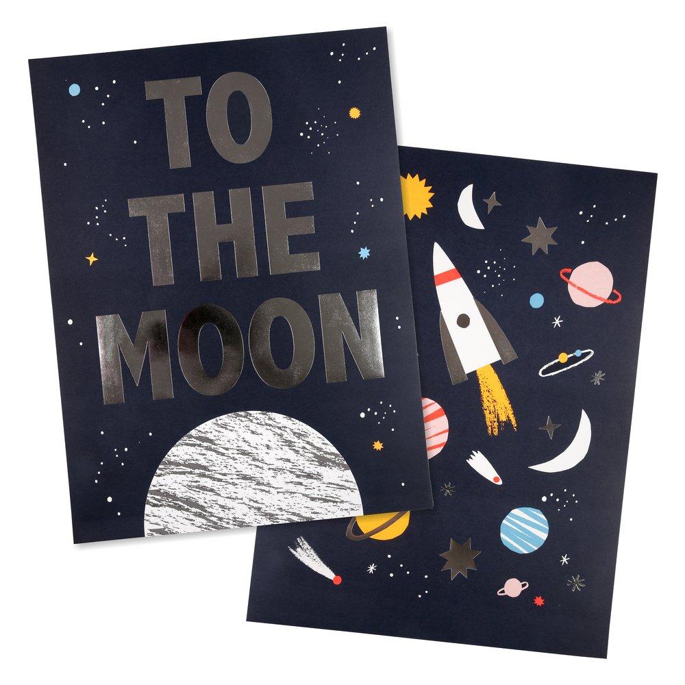 Perfect for the room of any aspiring astronaut. These two prints feature planets, rockets, and stars in bright colours and shiny silver foil. They will look out-of-this-world in a free-standing frame or hung on a wall.