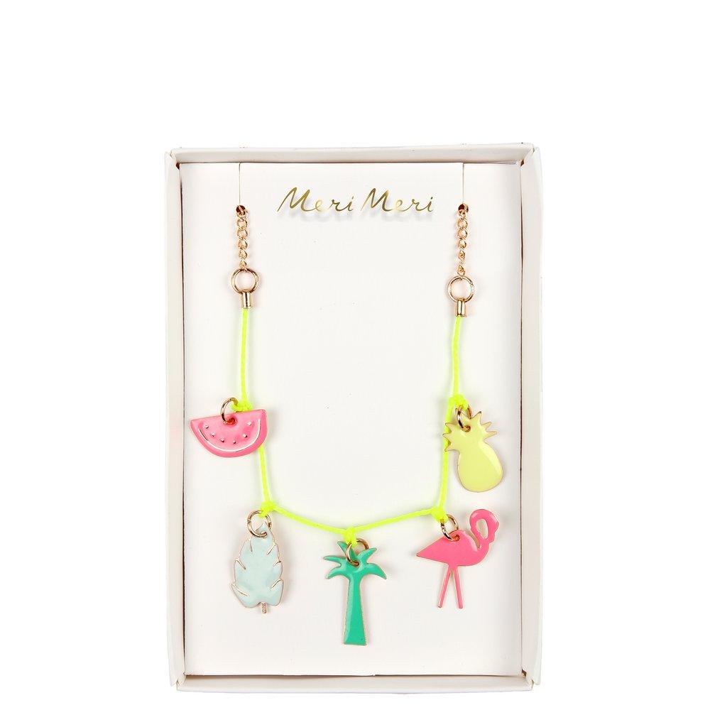 Looking for an accessory that is bright and fun? This tropical necklace, featuring beautiful enamel charms including a pineapple, flamingo, palm tree, leaf and a slice of melon, is totally fabulous!
