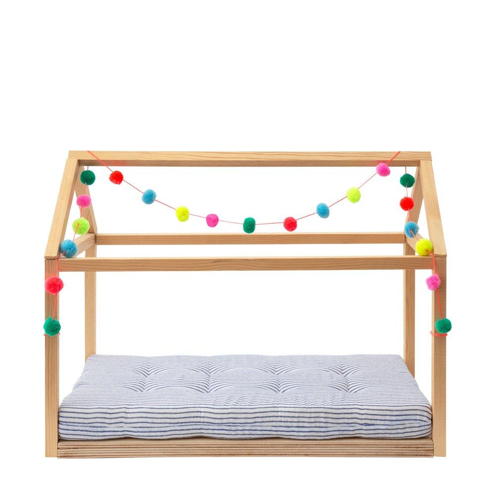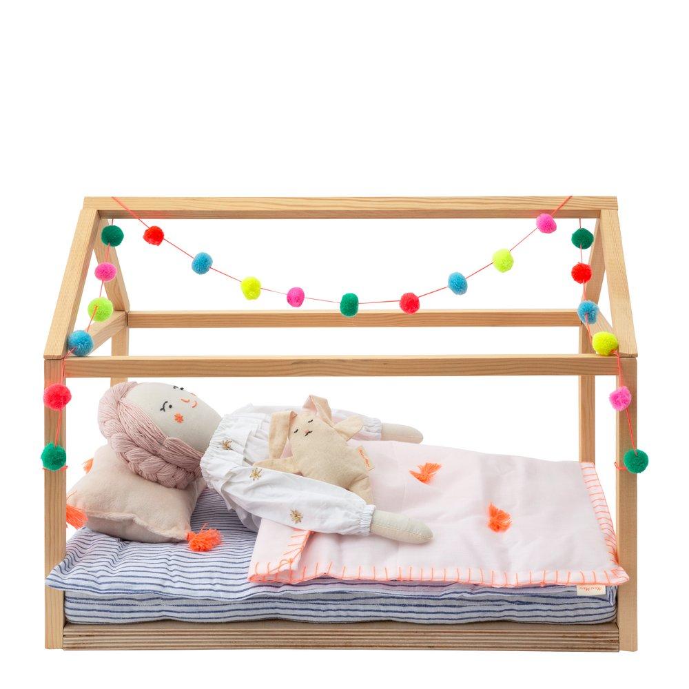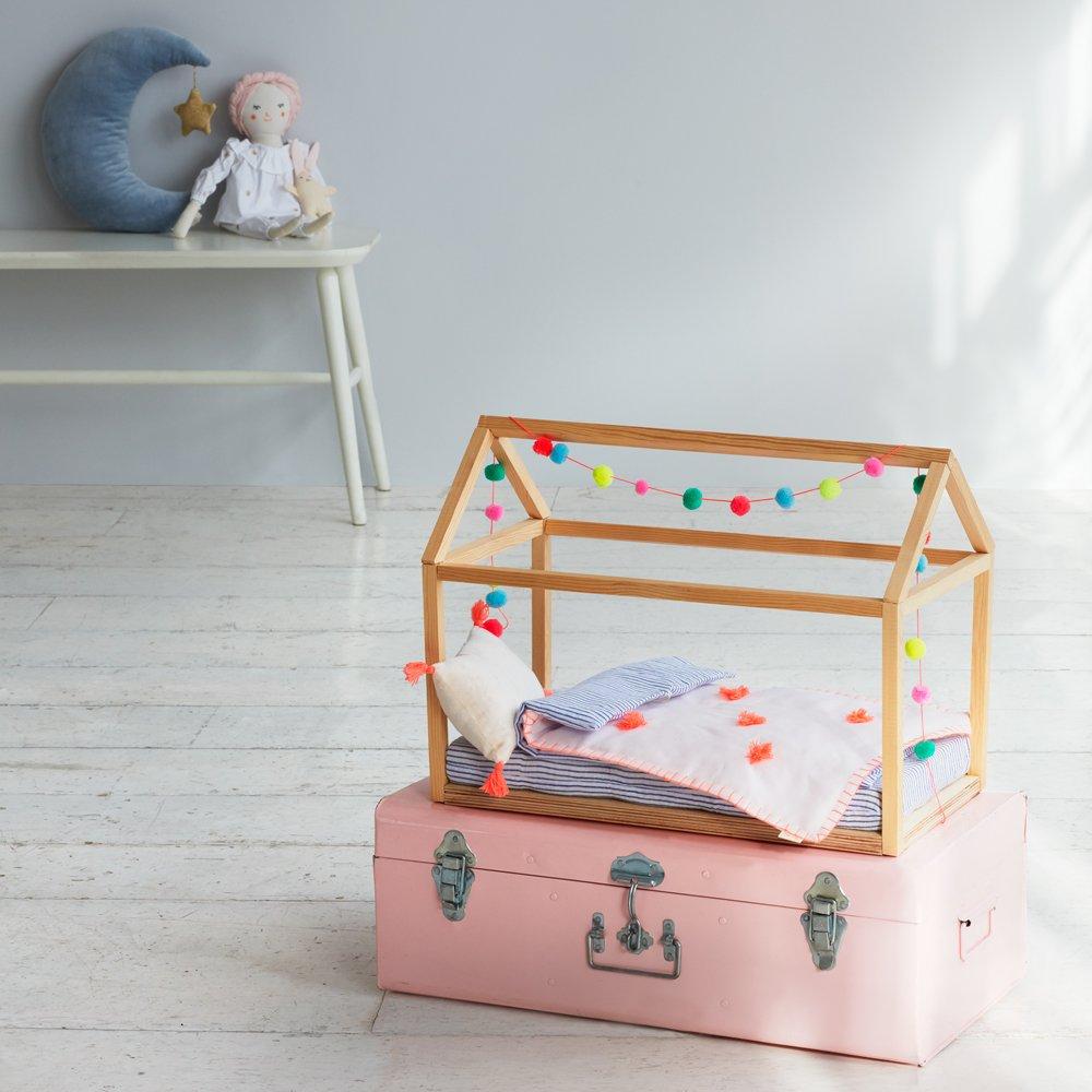 Let a favourite doll's sleep commence in style with our sensational wooden bed frame. Comes with a pretty pompom garland, to add a colourful on-trend touch, and a comfy stripy mattress.